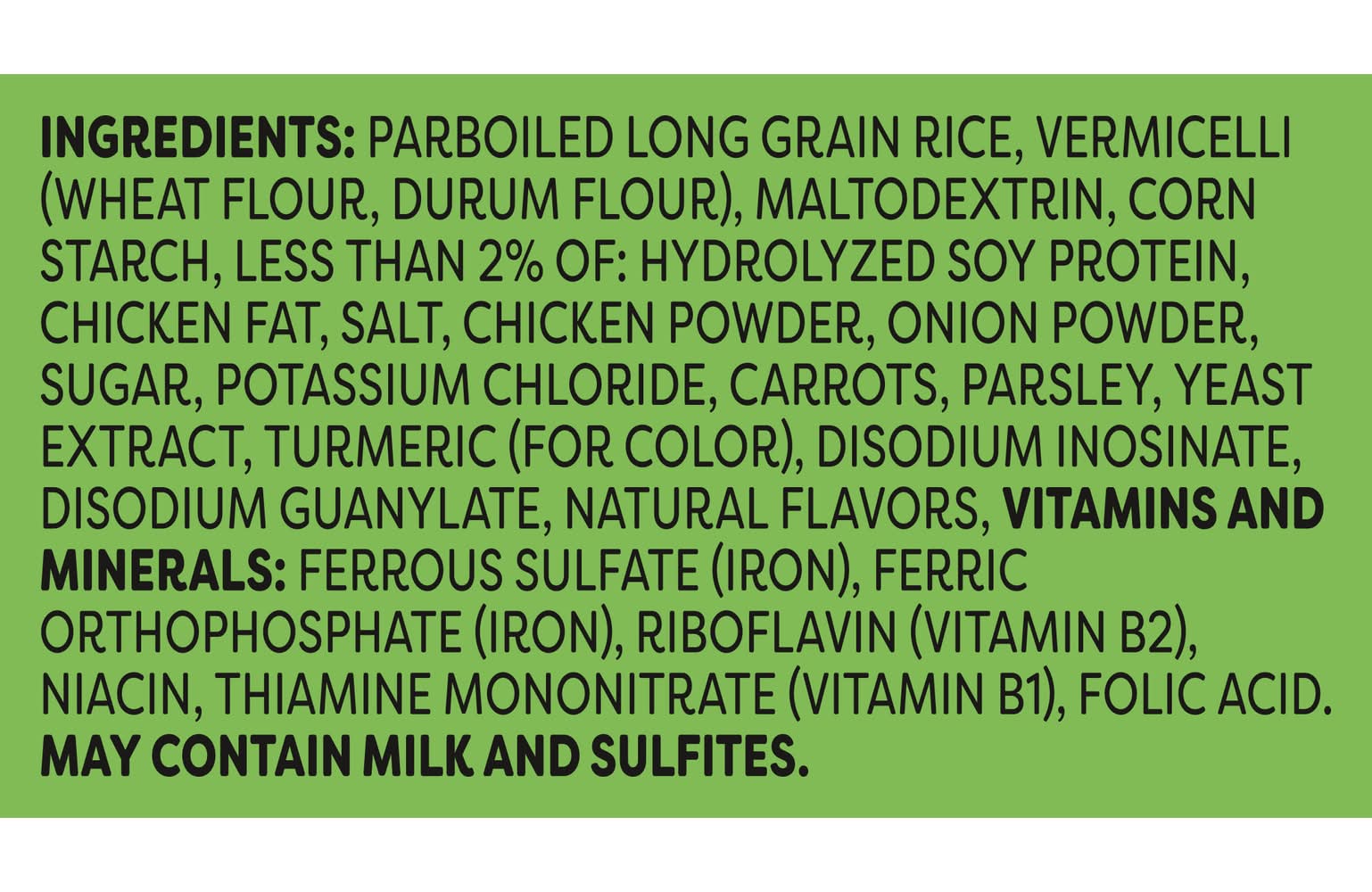 Ingredients: Parboiled Long Grain Rice, Vermicelli Wheat Flour, Durum Flour, Maltodextrin, Corn Starch, Less than 2% of: Hydrolyzed Soy Protein, Chicken Fat, Salt, Chicken Powder, Onion Powder, Sugar, Potassium Chloride, Carrots, Parsley, Yeast Extract, Turmeric for Color, Disodium Inosinate, Disodium Guanylate, Natural Flavors, Vitamins and Minerals: Ferrous Sulfate Iron, Ferric Orthophosphate Iron, Riboflavin Vitamin B2, Niacin, Thiamine Mononitrate Vitamin B1, Folic Acid Contains: Soybeans, Wheat, Milk
