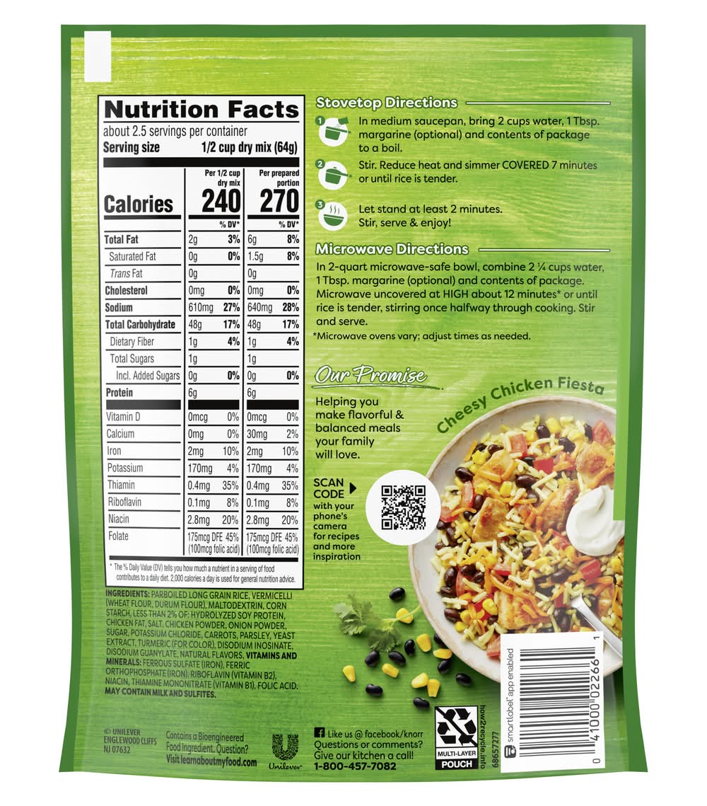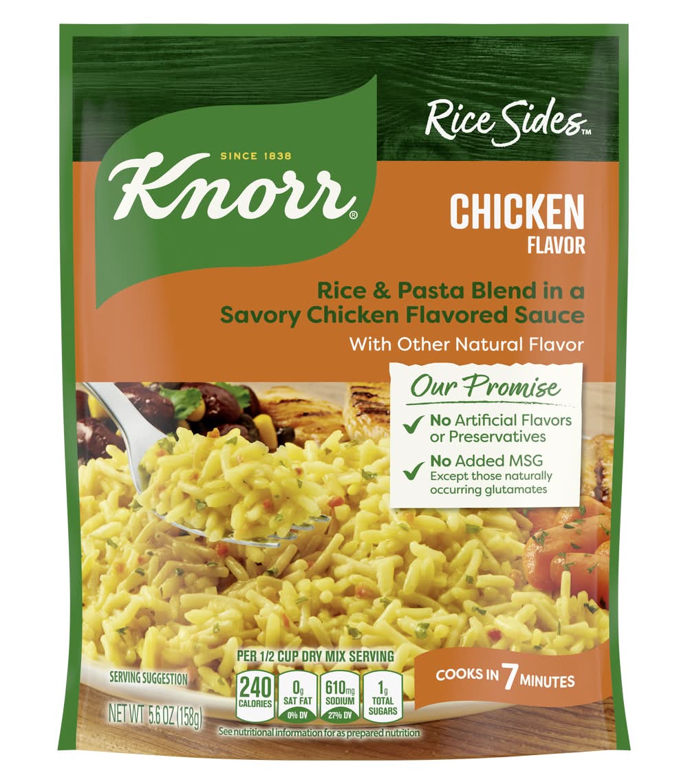Rice and pasta blend expertly combines onions, carrots, garlic, and parsley. Rice side dish is quick and easy to prepare. Cook in just 7 minutes on the stovetop or in the microwave, and they’re perfect as the base for a delicious main dish or as a standalone rice side dish. • Flavor: Chicken • Unilever, Englewood Cliffs, NJ, 07632