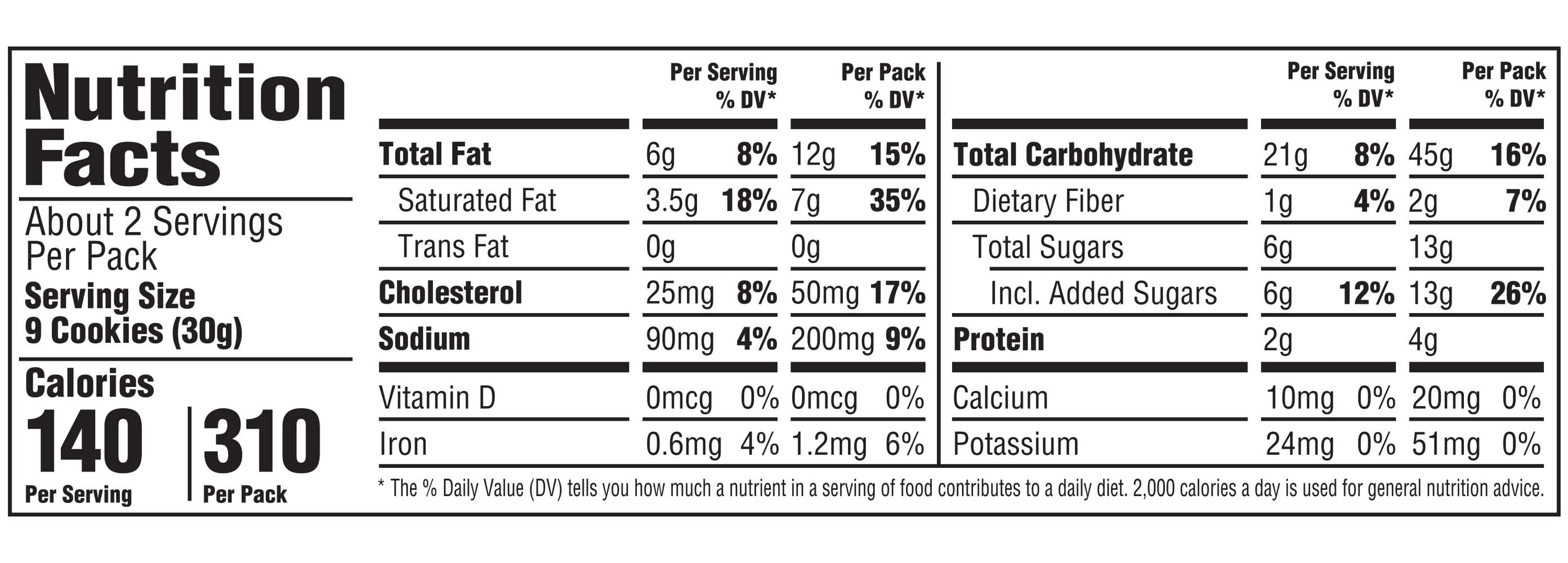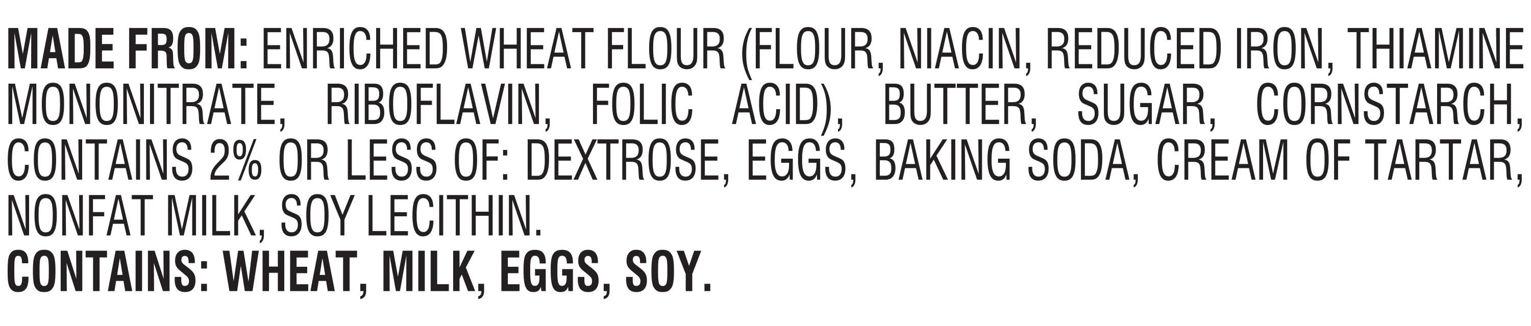 Ingredients: MADE FROM: ENRICHED WHEAT FLOUR (FLOUR, NIACIN, REDUCED IRON, THIAMINE MONONITRATE, RIBOFLAVIN, FOLIC ACID), BUTTER, SUGAR, CORNSTARCH, CONTAINS 2% OR LESS OF: DEXTROSE, EGGS, BAKING SODA, CREAM OF TARTAR, NONFAT MILK, SOY LECITHIN. CONTAINS: WHEAT, MILK, EGGS, SOY. Contains: CONTAINS: Egg, Gluten, Milk/Dairy, Soybean, Wheat