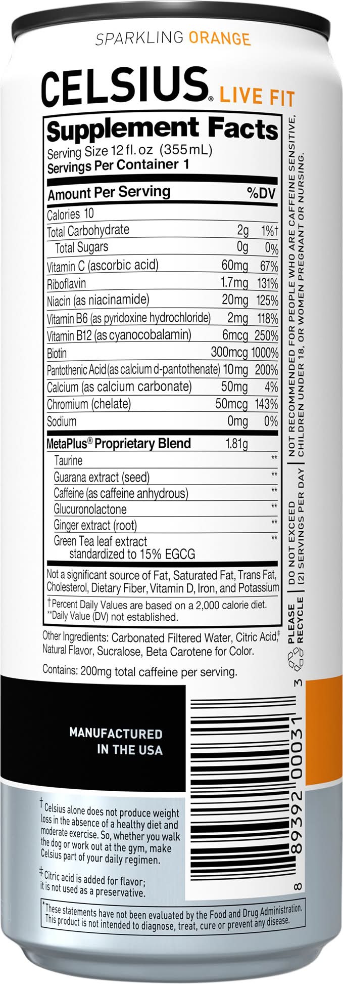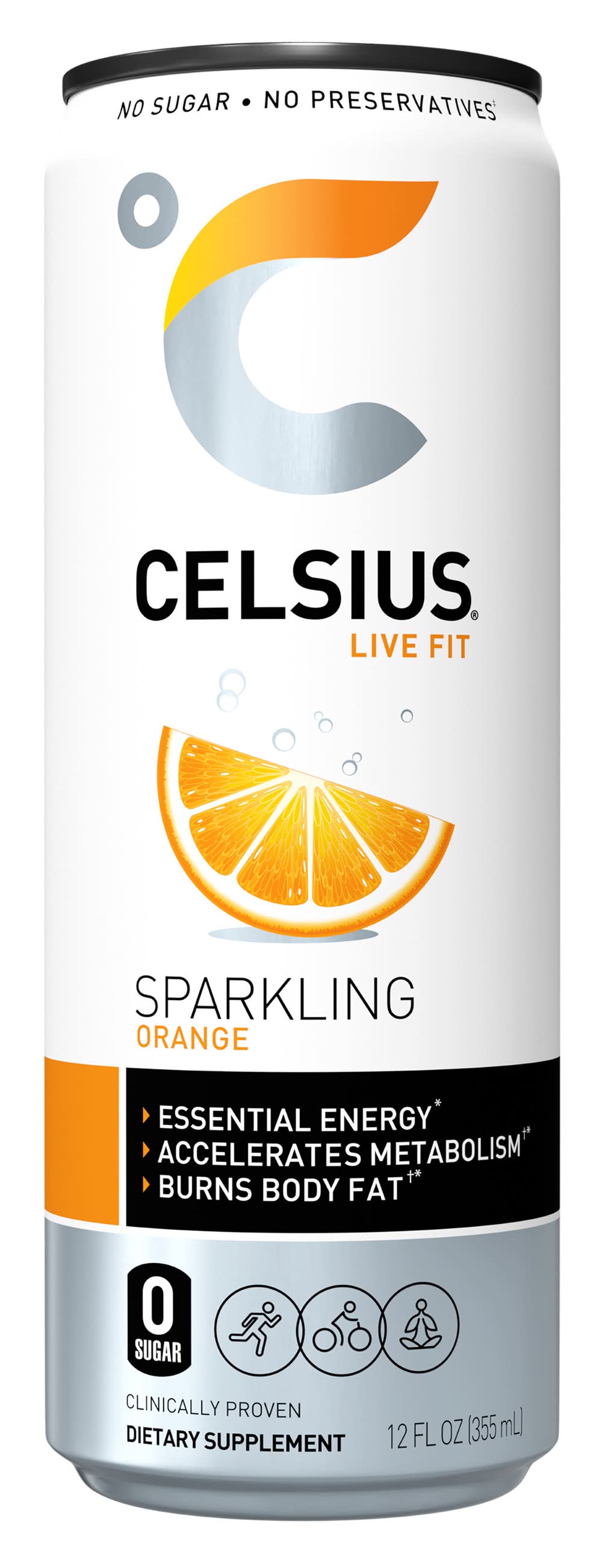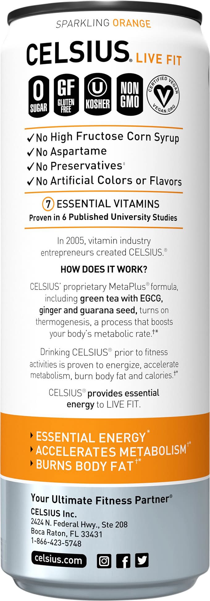 Burns body fat (celsius alone does not produce weight loss in the absence of a healthy diet and moderate exercise. So, whether you walk the dog or work out at the gym, make celsius part of your daily regimen). Clinically proven. No high fructose corn syrup. No aspartame. 7 essential vitamins proven in 6 published university studies. In 2005, vitamin industry entrepreneurs created celsius. How does it work? Celsius proprietary metaplus formula, including green tea with egcg ginger and guarana seed, turns on thermogenesis, a process that boosts your body's metabolic rate (celsius alone does not produce weight loss in the absence of a healthy diet and moderate exercise. So, whether you walk the dog or work out at the gym, make celsius part of your daily regimen). Drinking celsius prior to fitness activities is proven to energize, accelerate metabolism, burn body fat and calories (celsius alone does not produce weight loss in the absence of a healthy diet and moderate exercise. So, whether you walk the dog or work out at the gym, make celsius part of your daily regimen). • Flavor: Orange • Celsius Inc, 2424 N. Federal Hwy, Ste 208, Boca Raton, FL,33431 • Packaging: Reusable