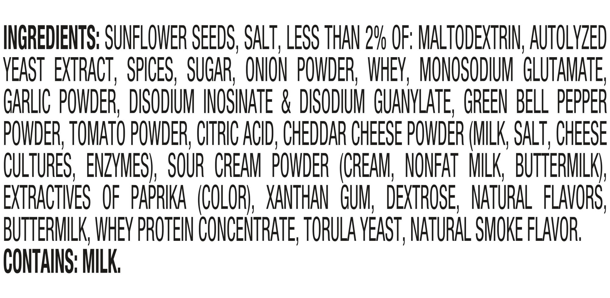 Ingredients: Sunflower Seeds, Salt, Less than 2% of: Maltodextrin, Autolyzed Yeast Extract, Spices, Sugar, Onion Powder, Whey, Monosodium Glutamate, Garlic Powder, Green Bell Pepper Powder, Tomato Powder, Citric Acid, Disodium Inosinate & Disodium Guanylate, Natural Flavors Including Smoke, Xanthan Gum, Cheddar Cheese Powder Milk, Salt, Cheese Cultures, Enzymes, Sour Cream Powder Cream, Nonfat Milk, Buttermilk, Extractives of Paprika Color, Dextrose, Buttermilk, Whey Protein Concentrate, Torula Yeast. Contains: 'Milk Contains', 'Soybeans May Contain'