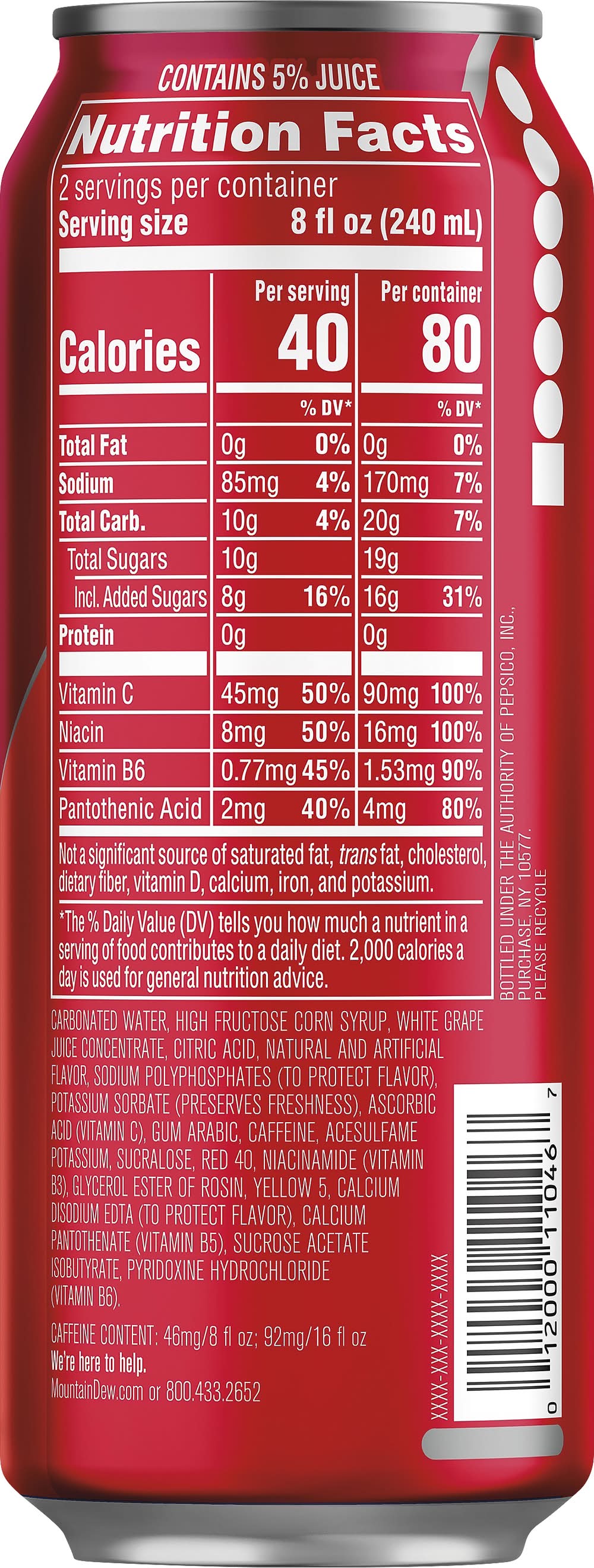 Ingredients: Carbonated Water, High Fructose Corn Syrup, White Grape Juice Concentrate, Citric Acid, Natural and Artificial Flavor, Sodium Polyphosphates (to Protect Flavor), Potassium Sorbate (Preserves Freshness), Ascorbic Acid (Vitamin C), Gum Arabic, Caffeine, Acesulfame Potassium, Sucralose, Red 40, Niacinamide (Vitamin B3), Glycerol Ester of Rosin, Yellow 5, Calcium Disodium EDTA (to Protect Flavor), Calcium Pantothenate (Vitamin B5), Sucrose Acetate Isobutyrate, Pyridoxine Hydrochloride (Vitamin B6) Contains 92mg of caffeine
