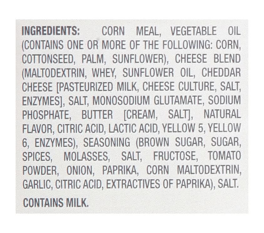 Ingredients: Corn Meal, Vegetable Oil (Contains One or More of the Following: Corn, Cottonseed, Palm, Sunflower), Cheese Blend (Maltodextrin, Whey, Sunflower Oil, Cheddar Cheese [Pasteurized Milk, Cheese Culture, Salt, Enzymes], Salt, Monosodium Glutamate, Sodium Phosphate, Butter [Cream, Salt], Natural Flavor, Citric Acid, Lactic Acid, Yellow 5, Yellow 6, Enzymes), Seasoning (Brown Sugar, Sugar, Spices, Molasses, Salt, Fructose, Tomato Powder, Onion, Paprika, Corn Maltodextrin, Garlic, Citric Acid, Extractives of Paprika), Salt Contains: Corn, Milk