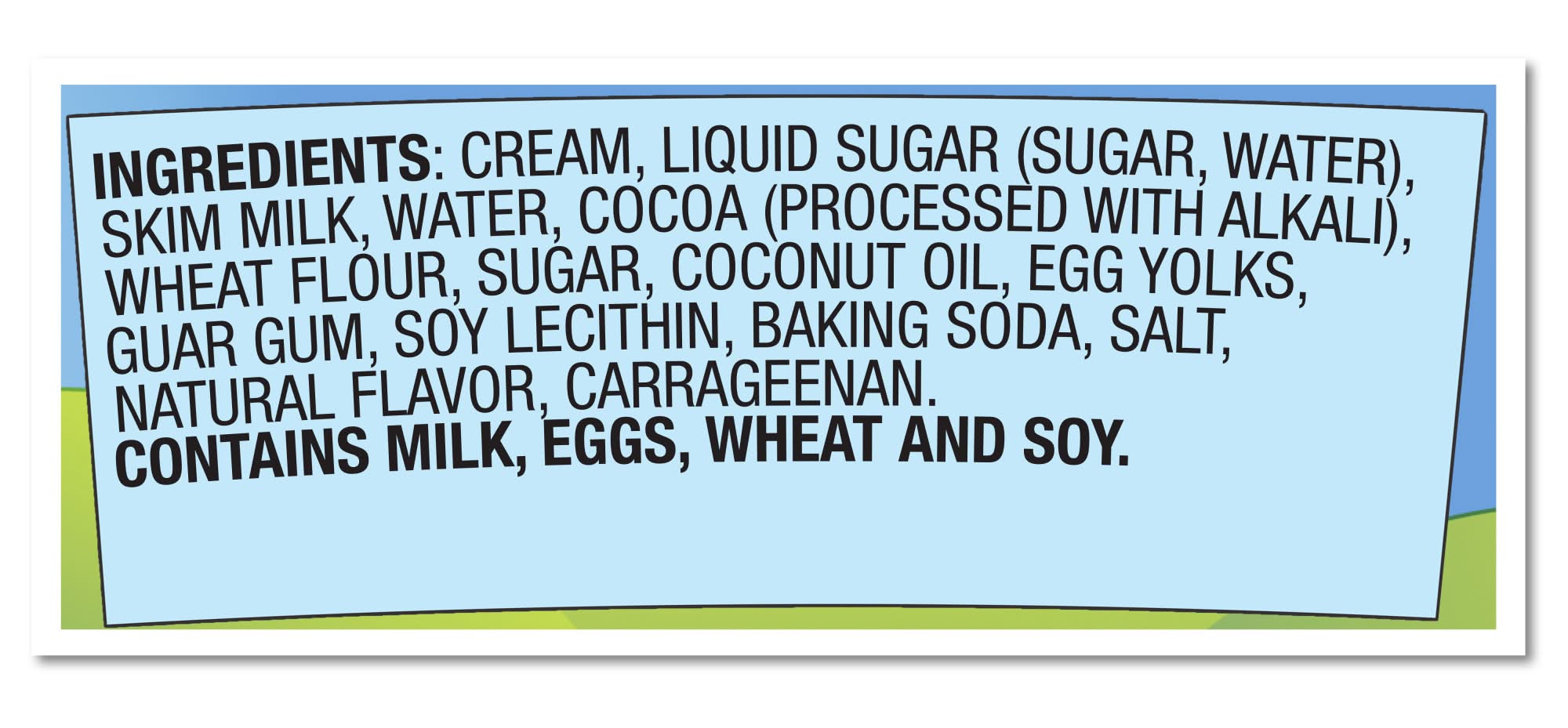 Ingredients: Cream, Liquid Sugar Sugar, Water, Skim Milk, Water, Cocoa Processed with Alkali, Wheat Flour, Sugar, Coconut Oil, Egg Yolks, Guar Gum, Soy Lecithin, Baking Soda, Salt, Natural Flavor, Carrageenan Contains: Milk, Eggs, Tree Nuts, Soybeans, Wheat