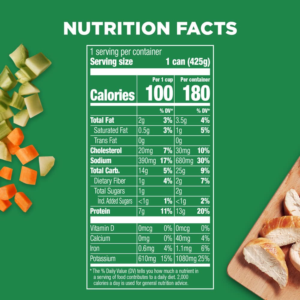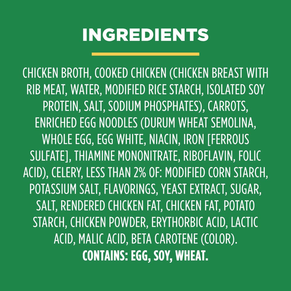 Ingredients: Chicken Broth, Cooked Chicken (Chicken Breast with Rib Meat, Water, Modified Rice Starch, Isolated Soy Protein, Salt, Sodium Phosphates), Carrots, Enriched Egg Noodles (Durum Wheat Semolina, Whole Egg, Egg White, Niacin, Iron [Ferrous Sulfate], Thiamine Mononitrate, Riboflavin, Folic Acid), Celery, Less Than 2% Of: Modified Corn Starch, Potassium Chloride, Flavorings, Yeast Extract, Sugar, Salt, Rendered Chicken Fat, Chicken Fat, Potato Starch, Chicken Powder, Erythorbic Acid, Lactic Acid, Malic Acid, Beta Carotene (Color), .  CONTAINS: EGG, SOY, WHEAT. Contains: Egg, Soy, Wheat