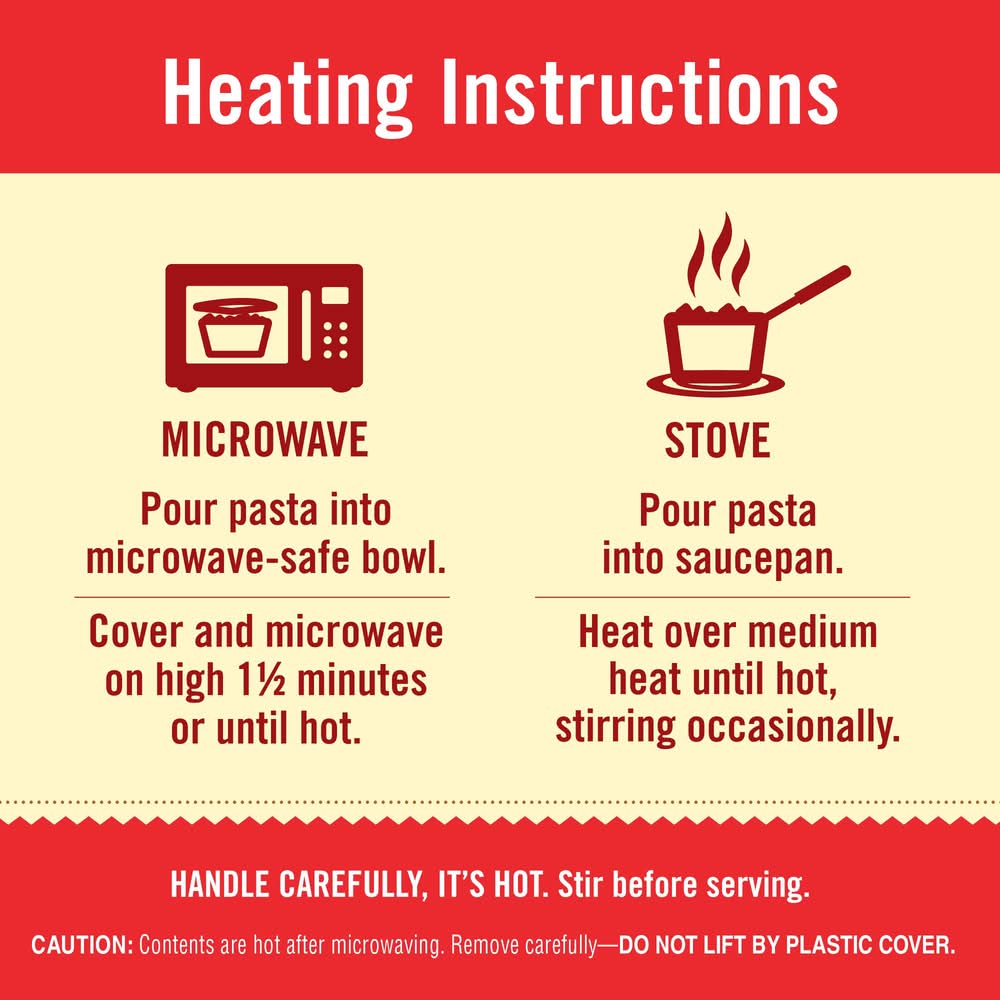 Heating directions: microwave: pour pasta into microwave-safe bowl; cover. microwave on high 11/2 minutes or until hot. stir before serving. handle carefully, it's hot! stove top: pour pasta into saucepan. heat over medium heat until hot, stirring occasionally. handle carefully, it's hot!