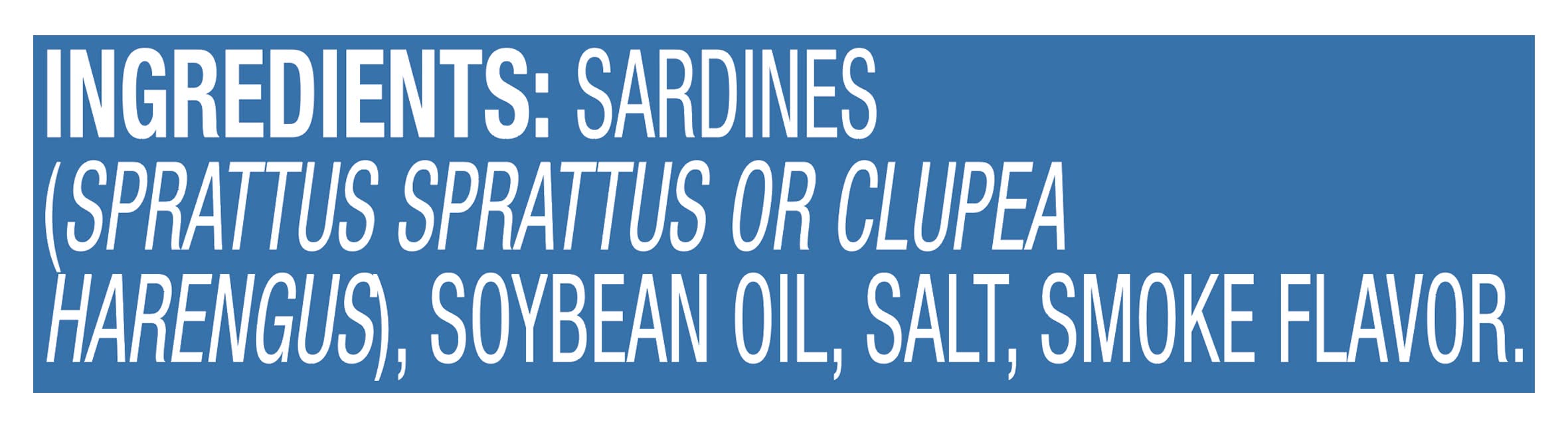 Ingredients: Sardines (Sprattus Sprattus or Clupea Harengus), Soybean Oil, Salt, Smoke Flavor Contains: Fish, Sardines, Soybeans