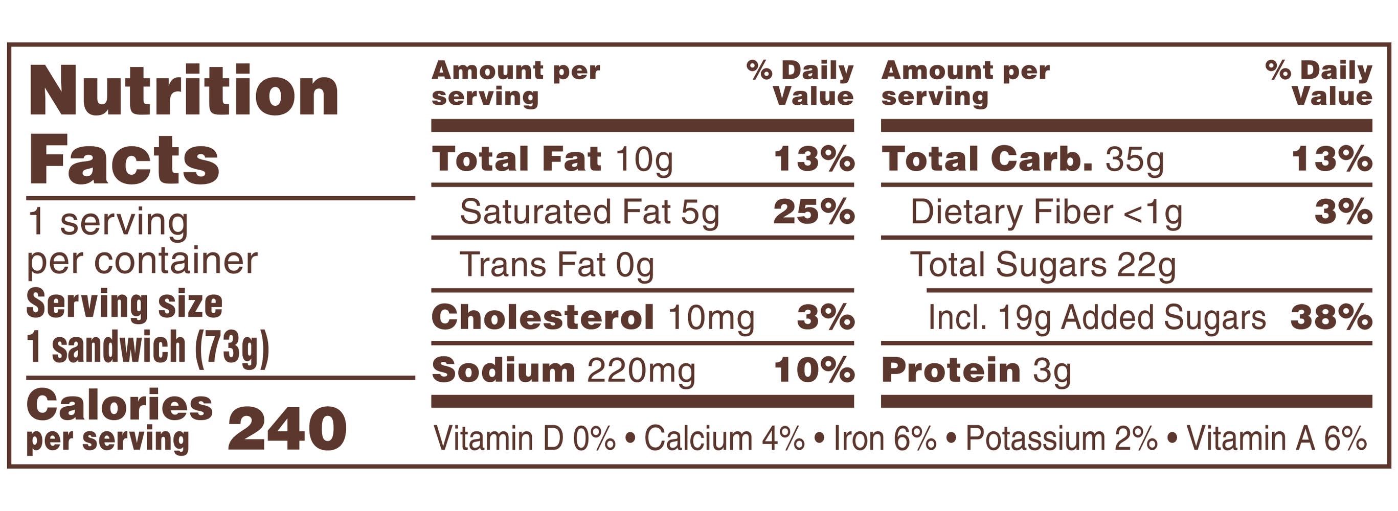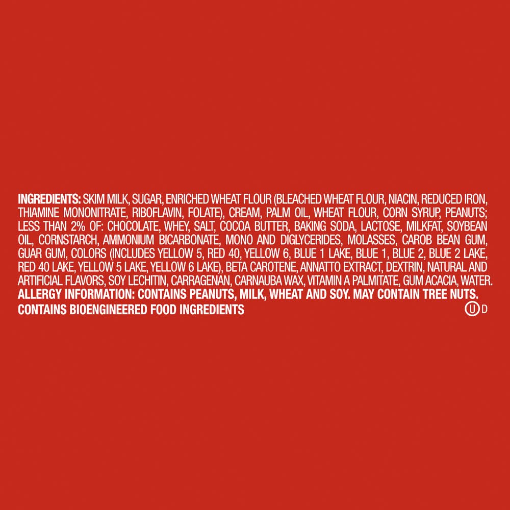 Ingredients: SKIMMILK, SUGAR, ENRICHEDWHEAT FLOUR (BLEACHEDWHEAT FLOUR, NIACIN, REDUCED IRON, THIAMINE MONONITRATE, RIBOFLAVIN, FOLATE), CREAM, PALM OIL, WHEAT FLOUR, CORN SYRUP, PEANUTS; LESS THAN 2% OF: CHOCOLATE, WHEY, SALT, COCOA BUTTER, BAKING SODA, LACTOSE, MILKFAT, SOYBEAN OIL, CORNSTARCH, AMMONIUM BICARBONATE, MONO AND DIGLYCERIDES, MOLASSES, CAROB BEAN GUM, GUAR GUM, COLORS (INCLUDES YELLOW 5, RED 40, YELLOW 6, BLUE 1 LAKE, BLUE 1, BLUE 2, BLUE 2 LAKE, RED 40 LAKE, YELLOW 5 LAKE, YELLOW 6 LAKE), BETA CAROTENE, ANNATTO EXTRACT, DEXTRIN, NATURAL AND ARTIFICIAL FLAVORS, SOY LECHITIN, CARRAGENAN, CARNAUBAWAX, VITAMIN A PALMITATE, GUMACACIA, WATER. Contains: CONTAINS PEANUTS, MILK, WHEAT AND SOY. MAY CONTAIN TREE NUTS.