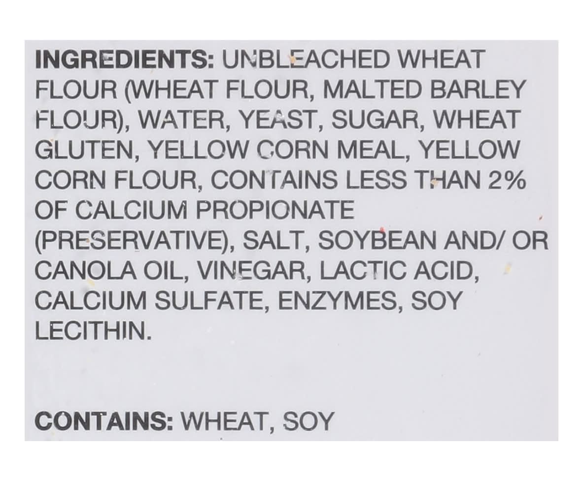Ingredients: Unbleached Wheat Flour (Wheat Flour, Malted Barley Flour), Water, Yeast, Sugar, Wheat Gluten, Yellow Corn Meal, Yellow Corn Flour, Contains Less than 2% of Calcium Propionate (Preservative), Salt, Soybean and/or Canola Oil, Vinegar, Lactic Acid, Calcium Sulfate, Enzymes, Soy Lecithin Contains: Wheat, Barley, Corn, Gluten, Soybeans