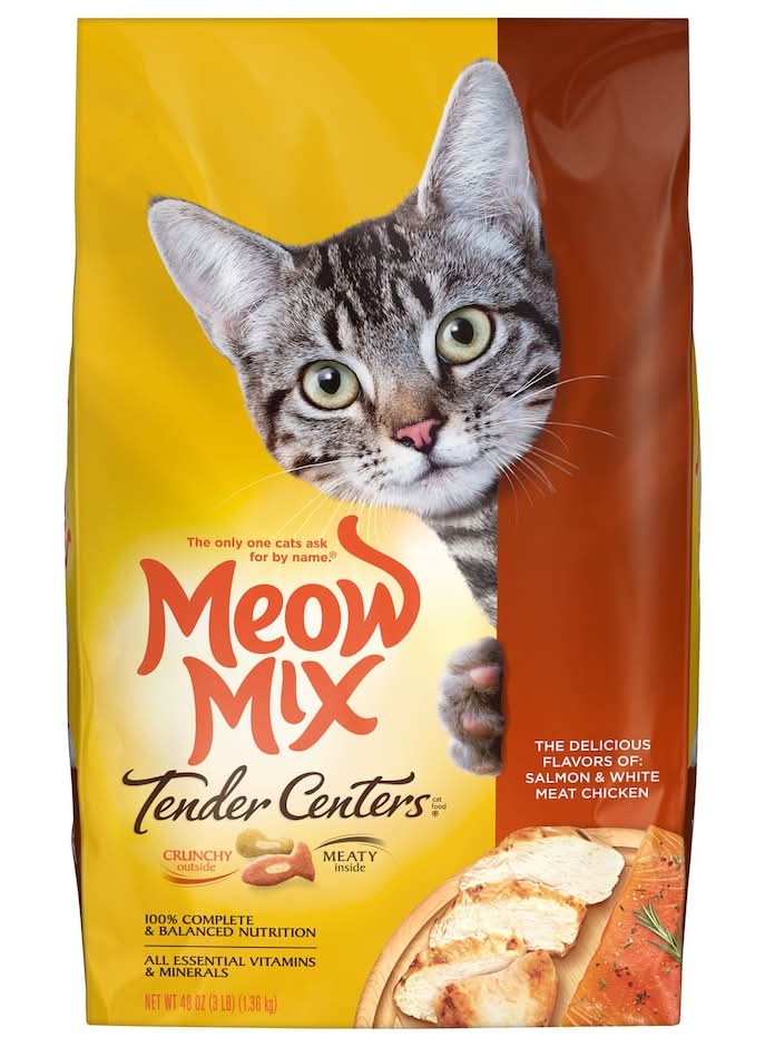 Each bite of Meow Mix Tender Centers Salmon and White Meat Chicken Flavors cat food combines irresistible salmon and chicken flavors with a crunchy outer layer and a meaty center. The protein rich recipe contains essential nutrients to help keep your cat healthy and happy. With wholesome ingredients and irresistible taste, no wonder it's the only one that cats ask for by name!