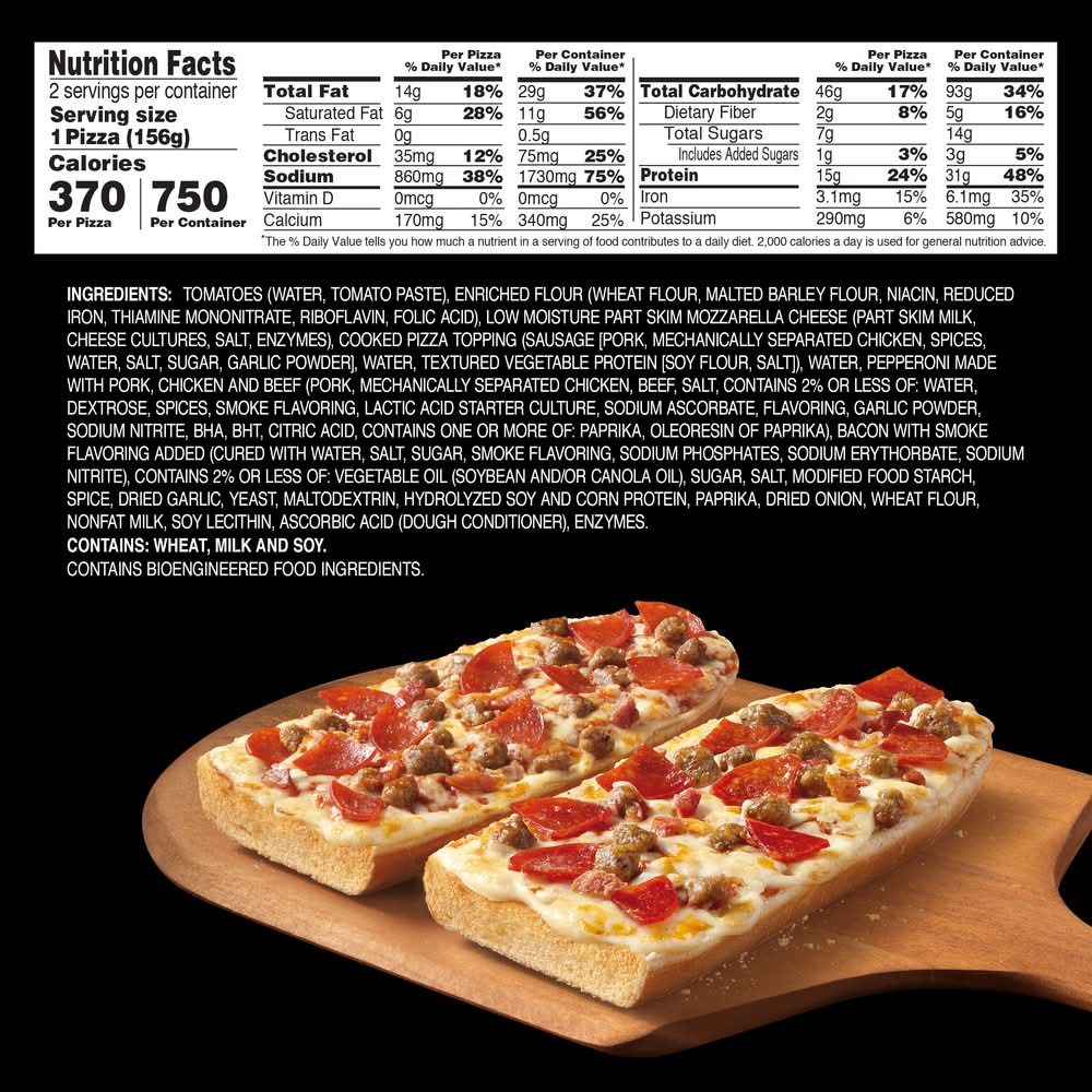 Ingredients: Tomatoes (Water, Tomato Paste), Enriched Flour (Wheat Flour, Malted Barley Flour, Niacin, Reduced Iron, Thiamine Mononitrate, Riboflavin, Folic Acid), Low Moisture Part Skim Mozzarella Cheese (Part Skim Milk, Cheese Cultures, Salt, Enzymes), Cooked Pizza Topping (Sausage [Pork, Mechanically Separated Chicken, Spices, Water, Salt, Sugar, Garlic Powder], Water, Textured Vegetable Protein [Soy Flour, Salt]), Water, Pepperoni Made With Pork, Chicken and Beef (Pork, Mechanically Separated Chicken, Beef, Salt, Contains 2% or Less of: Water, Dextrose, Spices, Smoke Flavoring, Lactic Acid Starter Culture, Sodium Ascorbate, Flavoring, Garlic Powder, Sodium Nitrite, BHA, BHT, Citric Acid, Contains One or More of: Paprika, Oleoresin of Paprika), Bacon with Smoke Flavoring Added (Cured with Water, Salt, Sugar, Smoke Flavoring, Sodium Phosphates, Sodium Erythorbate, Sodium Nitrite), Contains 2% or Less of: Vegetable Oil (Soybean and/or Canola Oil), Sugar, Salt, Modified Food Starch, Spice, Dried Garlic, Yeast, Maltodextrin, Hydrolyzed Soy and Corn Protein, Paprika, Dried Onion, Wheat Flour, Nonfat Milk, Soy Lecithin, Ascorbic Acid (Dough Conditioner), Enzymes Contains: Milk, Wheat, Soy