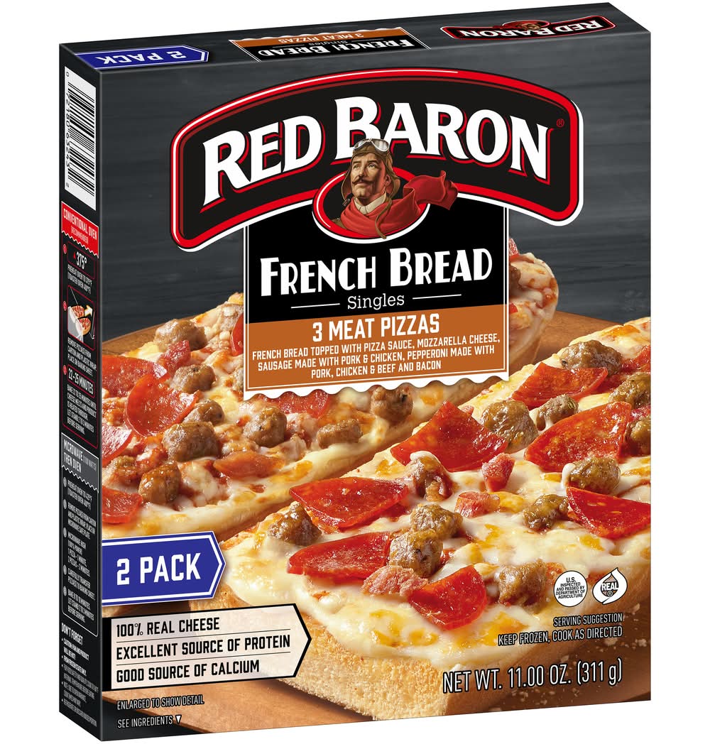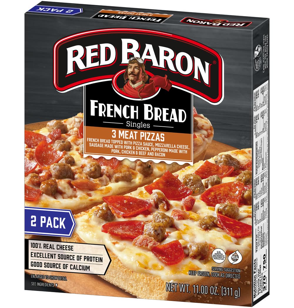 Red Baron French Bread Singles 3 Meat Pizza - Our single serve French bread pizzas are perfect on-the-go pizzas that can be ready to enjoy in minutes. Savor the mouthwatering taste of zesty tomato sauce, 100% real cheese and hearty toppings of sausage, pepperoni and bacon, all piled on top of our French bread crust. This unique take on pizza crust is flaky and crispy on the outside, fluffy and soft on the inside. Our delicious, cheesy 3 Meat French bread pizza singles are an excellent source of protein and a good source of calcium so you can feel good about every single bite. Whether it's part of a mid-week dinner, a late-night study session with friends, or a quick snack before sports practice, our personal frozen pizzas are ready when you need them. Easy to make and easier to enjoy, these frozen pizza singles serve up quality and flavor in minutes so you can get back to what matters. • Flavor: 3 meat • Schwan's Consumer Brands, Inc., Bloomington,MN,55437 • Packaging: Reusable