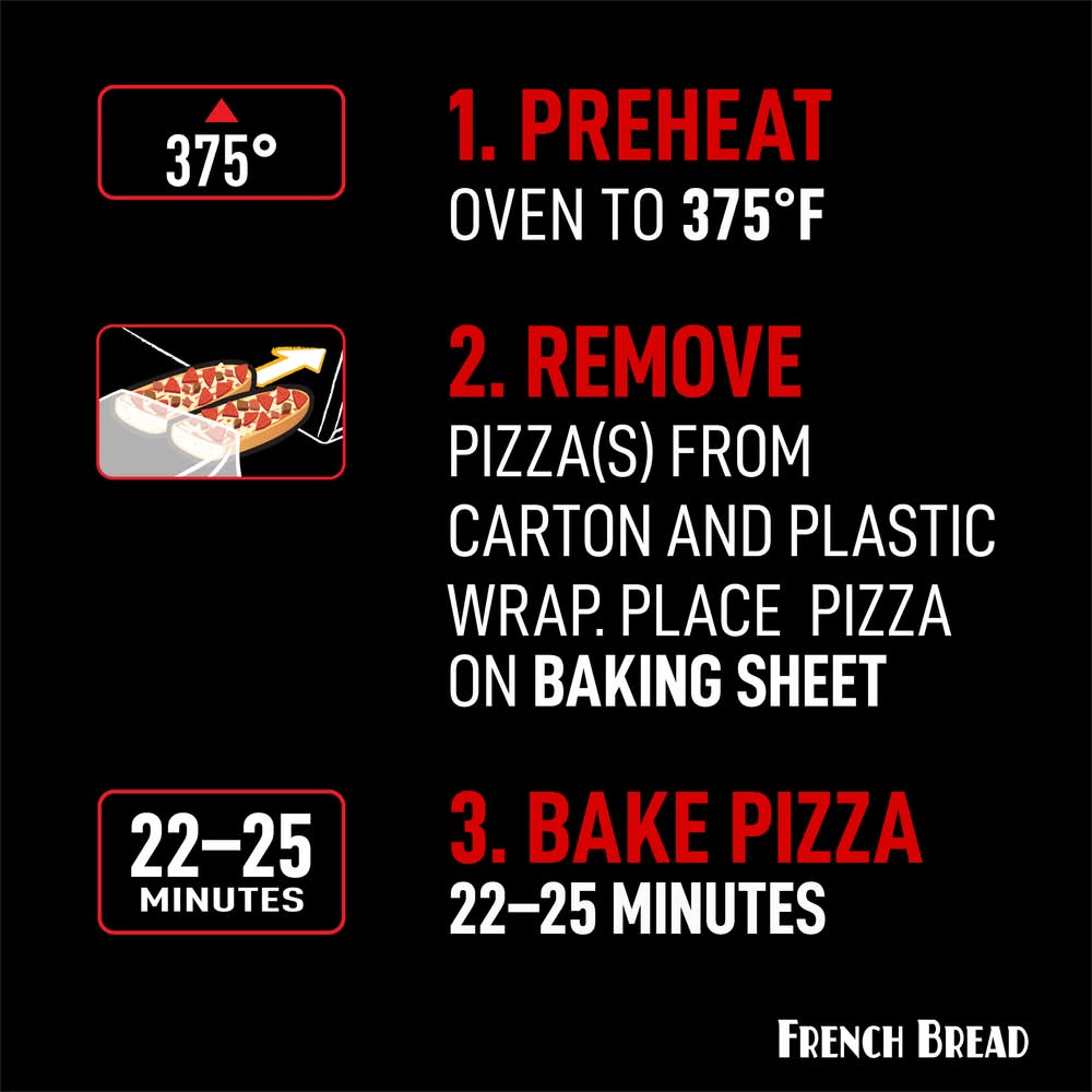 Directions for use: Conventional Oven (Recommended): 1 Preheat oven to 375 degrees F (toaster oven 400 degrees F). 2. Remove pizza(s) from carton and plastic wrap. Place on baking sheet. 3. Bake 22 to 25 minutes until cheese melts and product is heated through. Let stand 2 to 3 minutes before serving. Microwave the Oven (1100 watts): 1. Preheat oven to 425 degrees F (toaster oven 400 degrees F). 2. Remove pizza(s) from carton and plastic wrap. Place on microwave safe plate. 3. Microwave high (100% power) 1 pizza - 1 minute. 2 pizzas - 2 minutes. 4. Carefully transfer pizza(s) to baking sheet. 5. Bake 8 to 10 minutes. Let stand 2 to 3 minutes before serving. Don't Forget: Caution: Pan and product will be hot! From frozen state only. For food safety and quality, cook to 160 degrees F internal temperature before eating. Note: Due to oven variance, cook times may vary. Refrigerate or discard unused portion. Keep frozen, cook as directed. Storage recommendation: Keep frozen, cook as directed.
