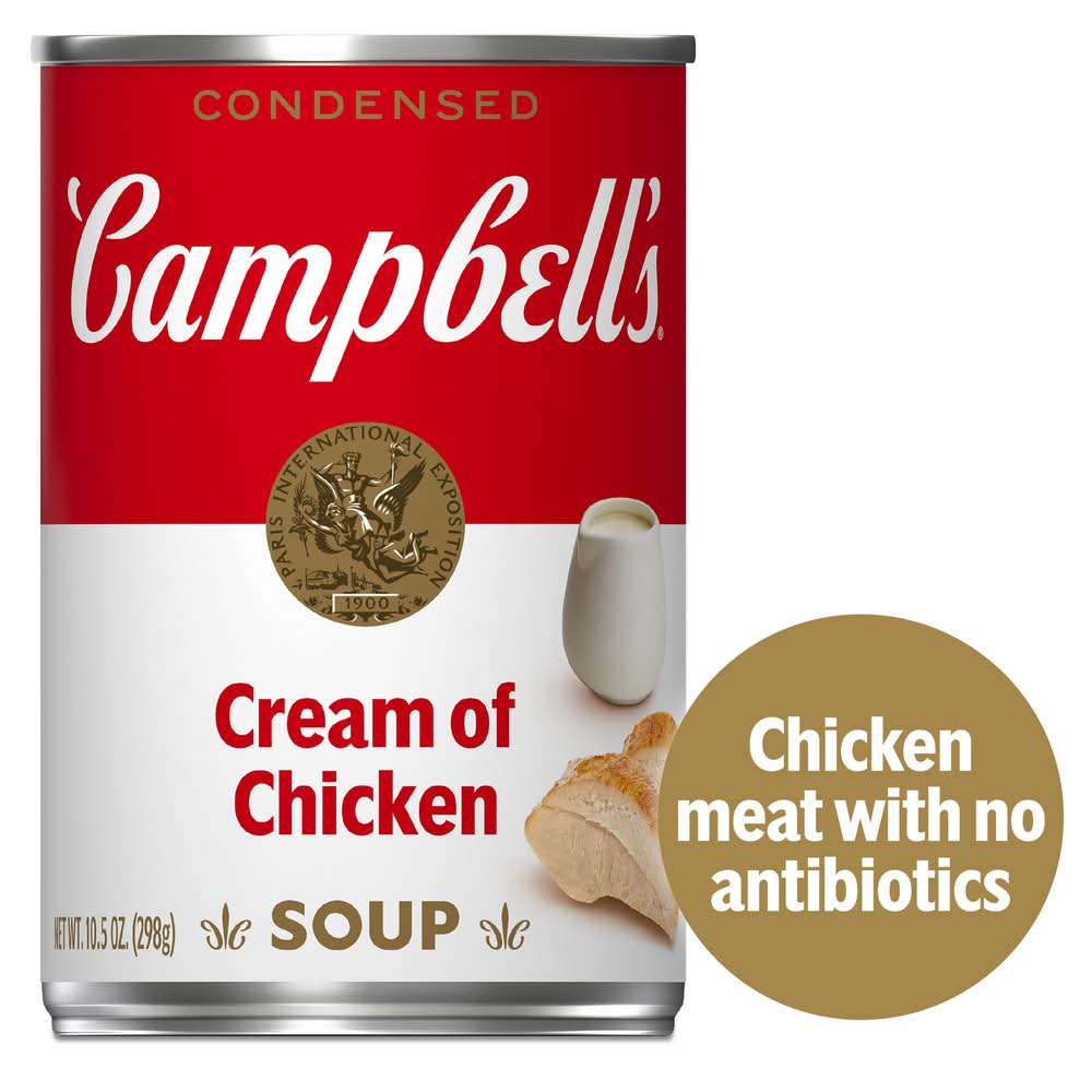 Creamy, comforting, and endlessly versatile, Campbell’s Cream of Chicken Soup brings rich, savory flavors to every bite. Made with tender chicken meat and farm-fresh cream, its velvety texture creates a cozy experience that feels like a hug in a bowl. With no added sugar, it's a soup that’s as thoughtful as it is delicious—perfect for sharing moments of care with loved ones. This canned soup is more than what goes in a bowl; it’s a secret weapon for easy meals. Create delicious recipes like one-pan chicken pot pie, stir it into casseroles for a creamy finish, create luscious sauces, or use it as a soup starter to elevate your weeknight dinners. From savory one-skillet meals to indulgent recipes that impress, it’s ready to inspire creativity with minimal effort. Heat it up for sipping soup comfort or transform it into something extraordinary—Campbell's creamy soups are adaptable and versatile. Stock up on Campbell's canned soup for quick recipes for cozy dinners or rainy-day pick-me-ups. Whether it’s a chilly afternoon or a moment to share, this soup makes every bite feel a little more fun and comforting. Campbell's Soup is always ready to deliver satisfying warmth and rich flavor. From tomato soup to cream of chicken and everything in between, Campbell's Soup is a trusted staple for those moments when food is more than nourishment—it’s an expression of love through every meal. • Campbell Soup Company, Camden,NJ,U.S.A. • Packaging: Reusable