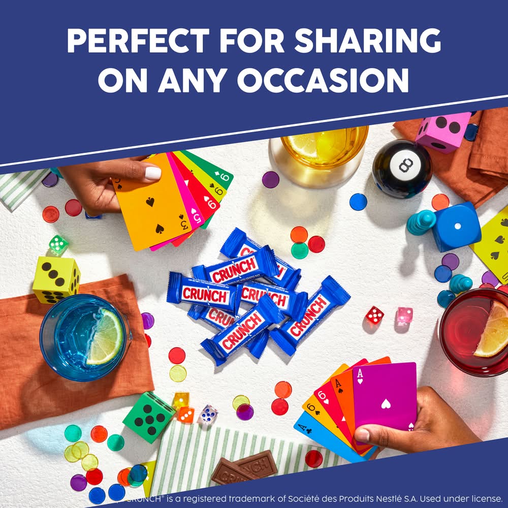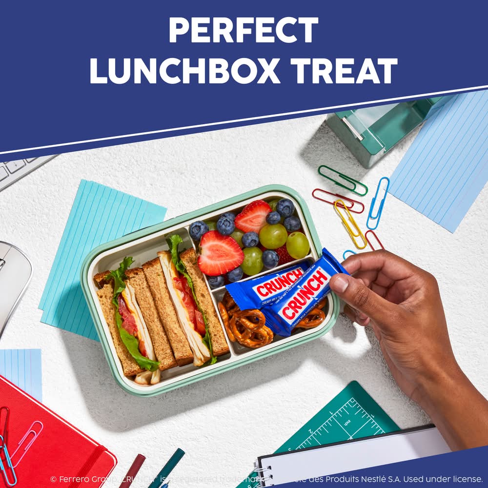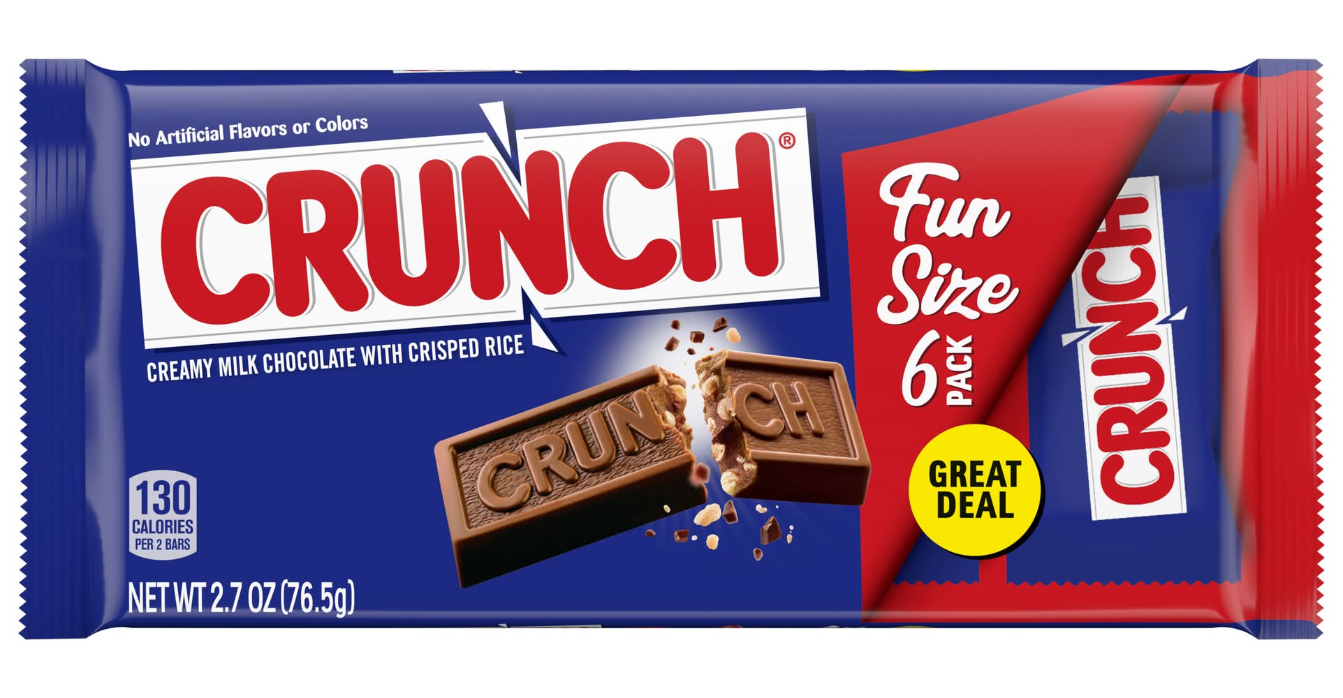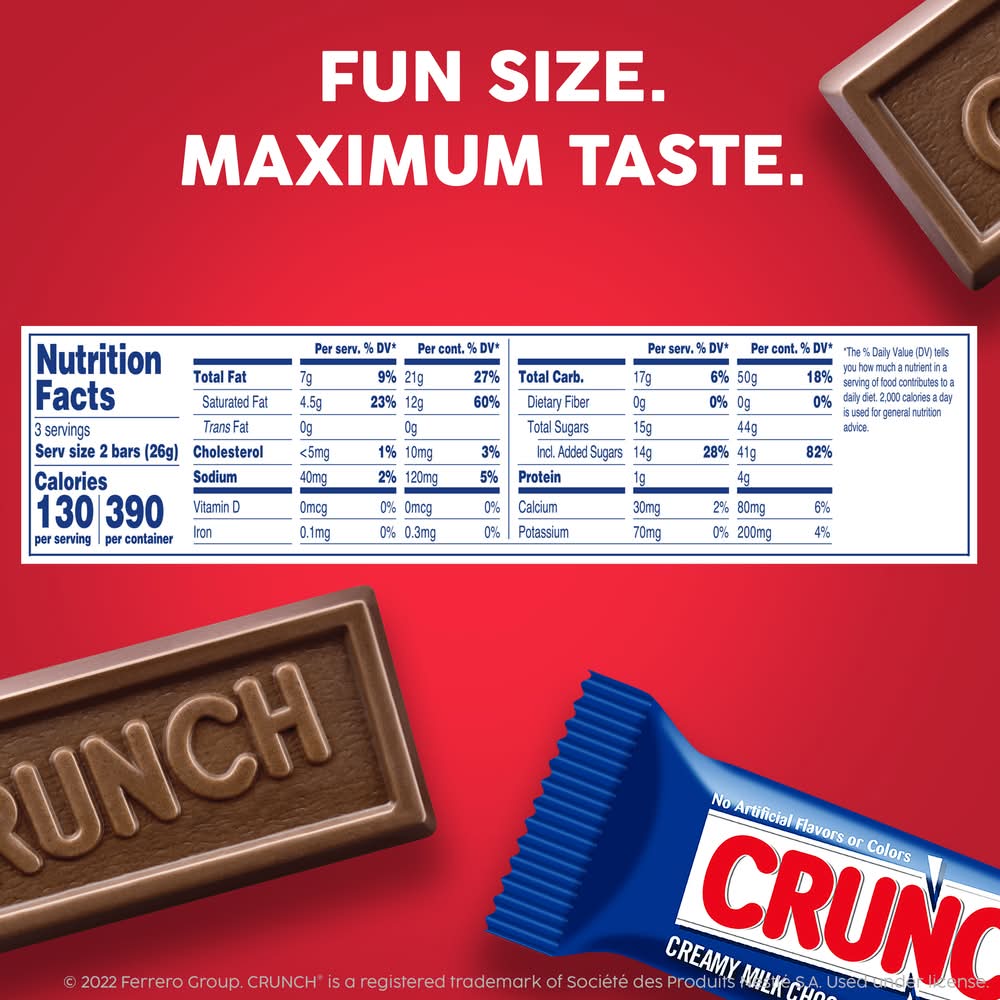 Enjoy the classic crunchy goodness of CRUNCH Fun Size chocolate bars. These shareable milk chocolate candy bars are packed with creamy milk chocolate and crispy rice for that irresistible taste you can’t resist. Since 1938, CRUNCH has delivered joy to chocolate lovers with its unmistakable appeal and crunchy texture. Known for its signature crisp and satisfying bite, it remains a nostalgic favorite for fans of classic confections. Crafted with 100% milk chocolate and made without artificial flavors or colors, each fun size bar offers the perfect mix of sweetness and airy crisped rice in a convenient size that’s easy to grab, share, or enjoy on the go. Whether you're on an office break, watching your favorite show, enjoying family game night, or filling a Halloween candy bowl, CRUNCH Fun Size bars are a go-to treat for all kinds of moments. Turn up the fun with these individually wrapped candies, great for sharing with friends, adding to party bags or Easter baskets, including in Valentine’s Day gifts, or simply treating yourself to a bite of chocolate joy during your favorite celebration.