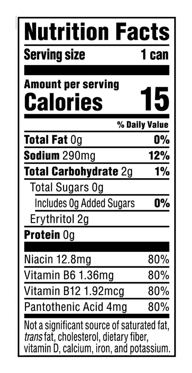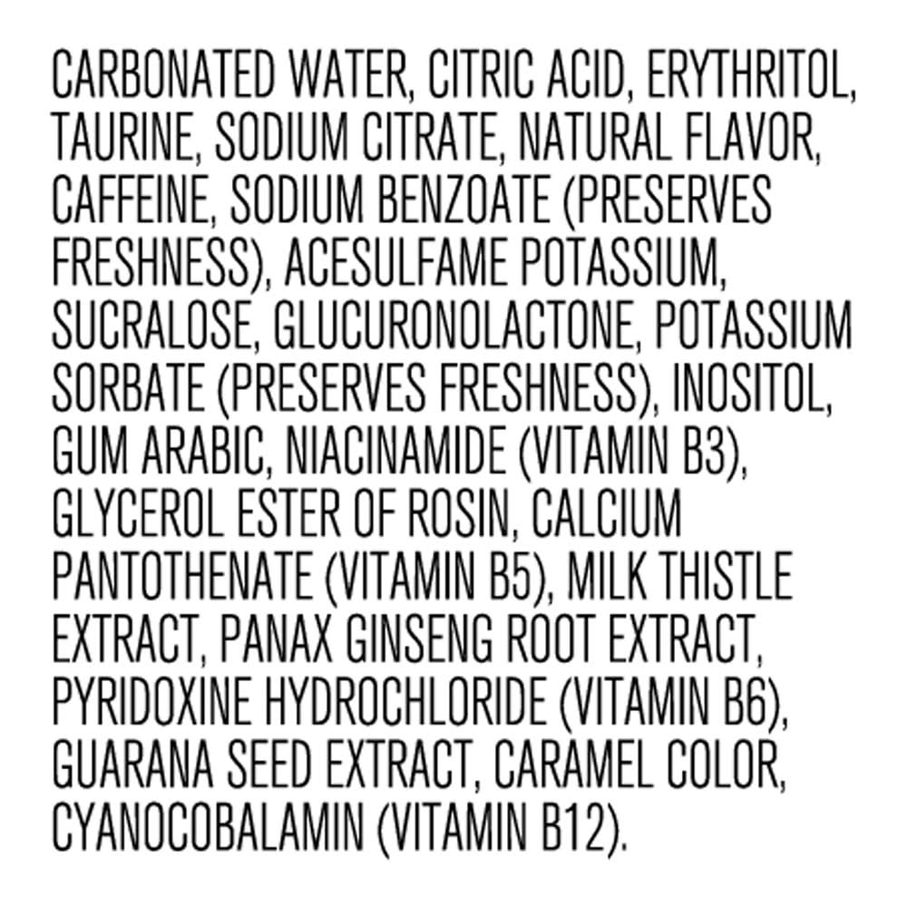 Ingredients: Carbonated Water, Citric Acid, Erythritol, Taurine, Sodium Citrate, Natural Flavor, Caffeine, Sodium Benzoate (Preserves Freshness), Acesulfame Potassium, Sucralose, Glucuronolactone, Potassium Sorbate (Preserves Freshness), Inositol, Gum Arabic, Niacinamide (Vitamin B3), Glycerol Ester of Rosin, Calcium Pantothenate (Vitamin B5), Milk Thistle Extract, Panax Ginseng Root Extract, Pyridoxine Hydrochloride (Vitamin B6), Guarana Seed Extract, Caramel Color, Cyanocobalamin (Vitamin B12) Contains: Milk