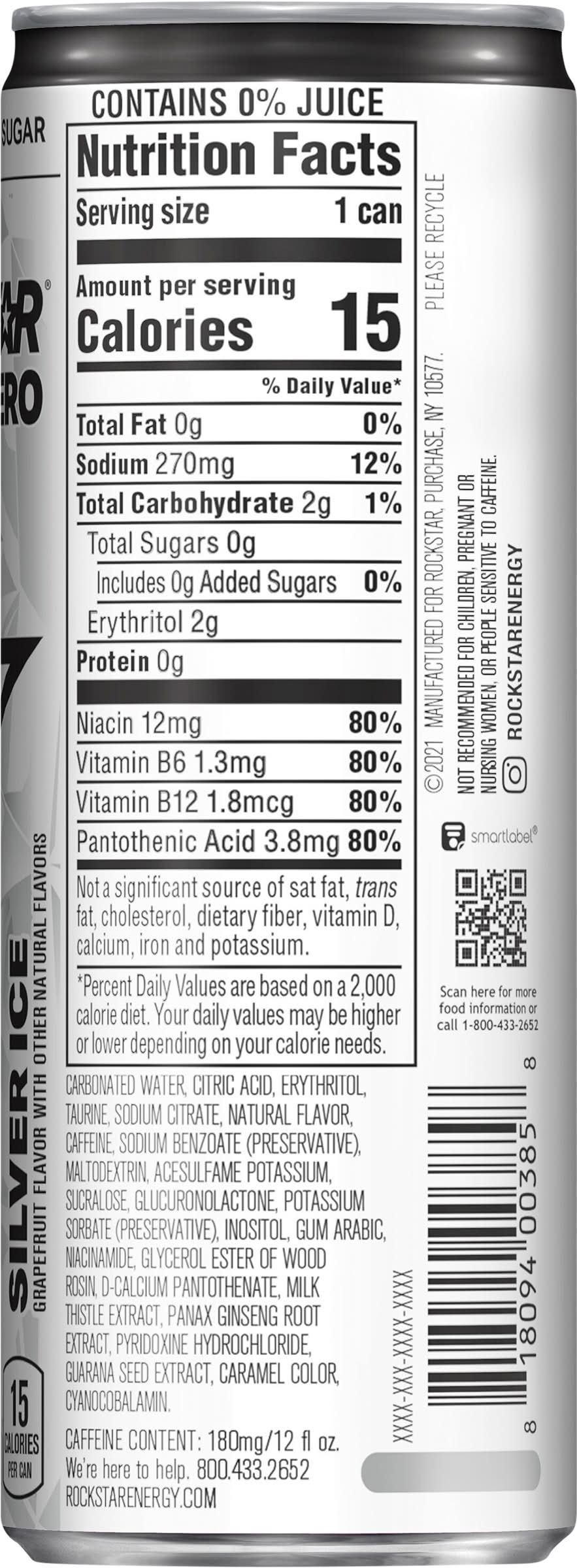 Silver Ice Rockstar Pure Zero is the ideal energy drink for those with active lifestyles. Featuring a unique beverage blend, Rockstar uses B vitamins, taurine, and caffeine to provide an extra boost of energy anytime you need it. Ideal for your daily workout, waking up full of energy for work, or staying hydrated while running errands.PROP 65 BPA Many cans containing foods and beverages sold here have epoxy linings used to avoid microbial contamination and to extend shelf life. Lids on jars and caps on bottles may also have epoxy linings. Some of these linings can leach small amounts of bisphenol A (BPA) into the food or beverage. BPA is a chemical known to the State of California to cause harm to the female reproductive system. For more information go to: www.P65Warnings.ca.gov/BPA Flavor: Silver ice