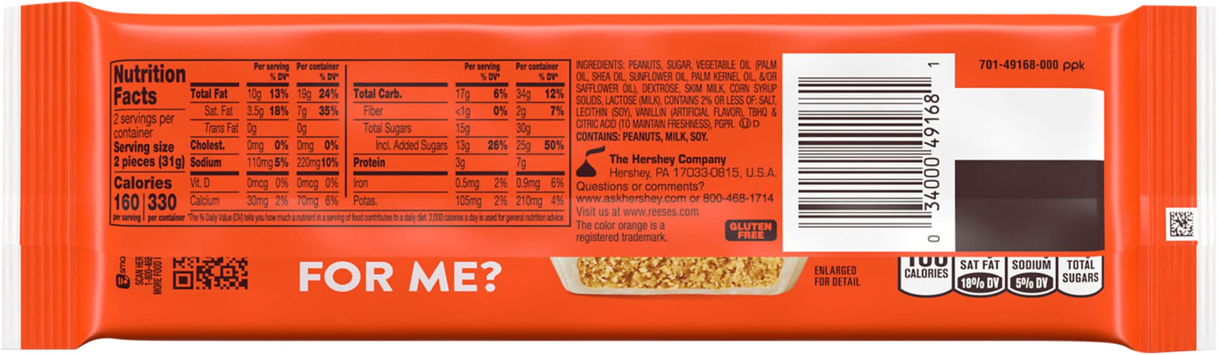 Ingredients: Peanuts, Sugar, Vegetable Oil (Palm Oil, Shea Oil, Sunflower Oil, Palm Kernel Oil, &/or Safflower Oil), Dextrose, Skim Milk, Corn Syrup Solids, Lactose (Milk), Contains 2% or Less of: Salt, Lecithin (Soy), Vanillin (Artificial Flavor), TBHQ & Citric Acid (to Maintain Freshness), PGPR Contains: Peanuts, Milk, Lactose, Soybeans