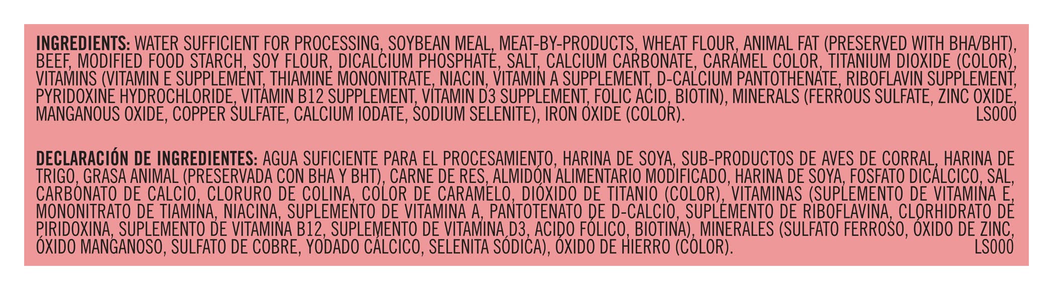 Ingredients: Water Sufficient for Processing, Soybean Meal, Meat-By-Products, Wheat Flour, Animal Fat (Preserved with BHA/BHT), Beef, Modified Food Starch, Soy Flour, Dicalcium Phosphate, Salt, Calcium Carbonate, Caramel Color, Titanium Dioxide (Color), Vitamins (Vitamin E Supplement, Thiamine Mononitrate, Niacin, Vitamin A Supplement, D-Calcium Pantothenate, Riboflavin Supplement, Pyridoxine Hydrochloride, Vitamin B12 Supplement, Vitamin D3 Supplement, Folic Acid, Biotin), Minerals (Ferrous Sulfate, Zinc Oxide, Manganous Oxide, Copper Sulfate, Calcium Iodate, Sodium Selenite), Iron Oxide (Color). LS000 Contains: Soybeans, Wheat