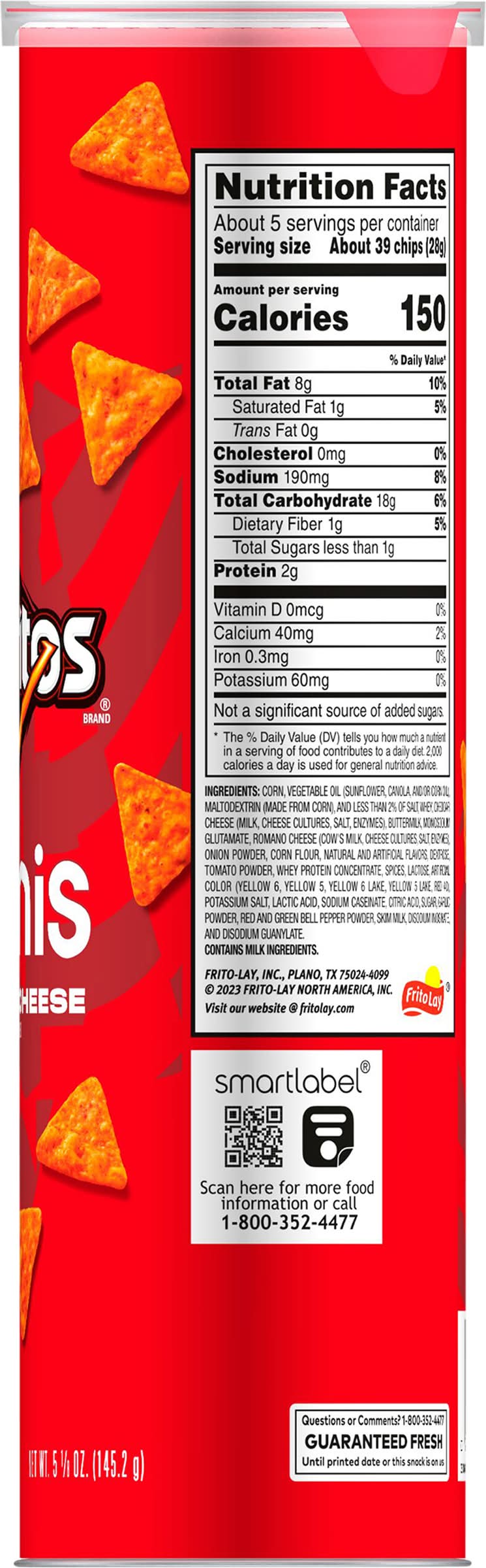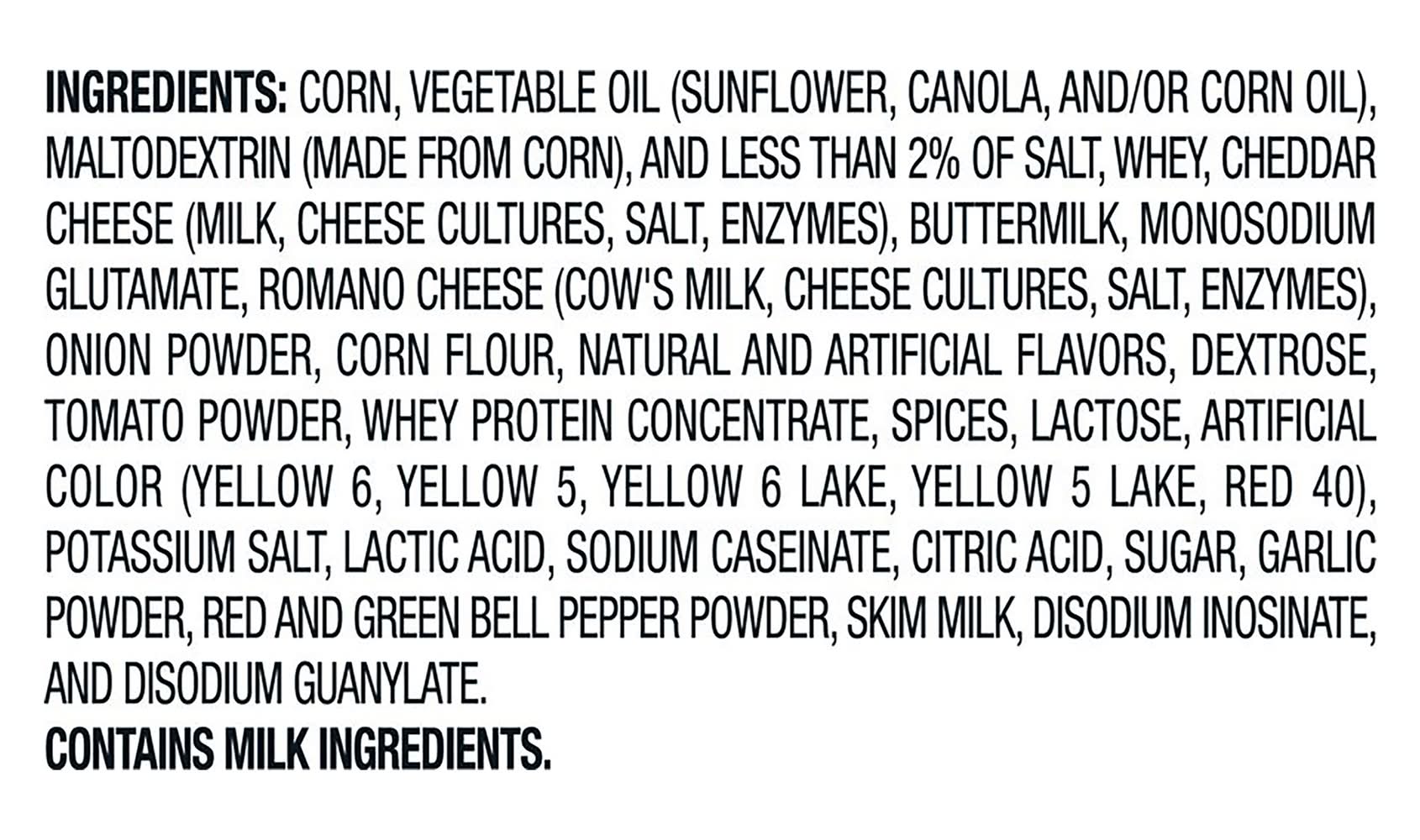 Ingredients: Corn, Vegetable Oil (Sunflower Canola and/or Corn Oil), Maltodextrin (Made from Corn), and Less than 2% of Salt, Whey, Cheddar Cheese (Milk Cheese Cultures Salt Enzymes), Buttermilk, Monosodium Glutamate, Romano Cheese (Cow’s Milk Cheese Cultures Salt Enzymes), Onion Powder, Corn Flour, Natural and Artificial Flavors, Dextrose, Tomato Powder, Whey Protein Concentrate, Spices, Lactose, Artificial Color (Yellow 6 Yellow 5 Yellow 6 Lake Yellow 5 Lake Red 40), Potassium Salt, Lactic Acid, Sodium Caseinate, Citric Acid, Sugar, Garlic Powder, Red and Green Bell Pepper Powder, Skim Milk, Disodium Inosinate, and Disodium Guanylate Contains: Milk, Corn, Lactose