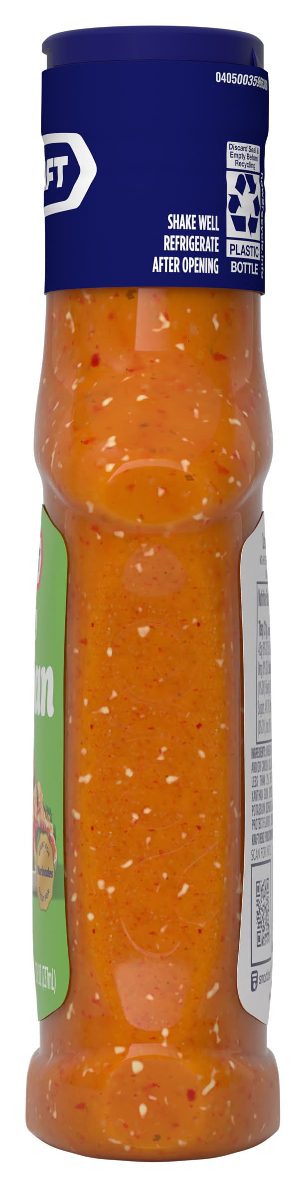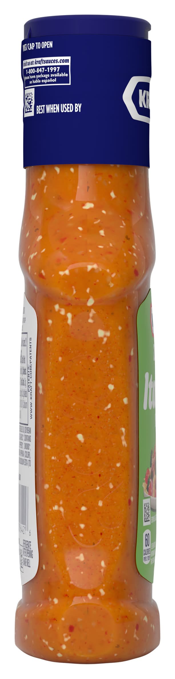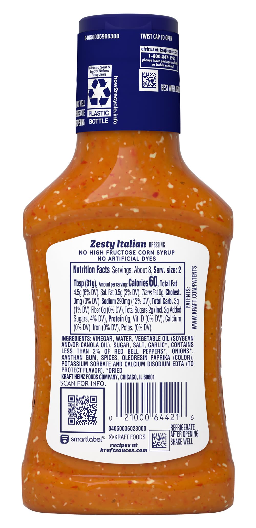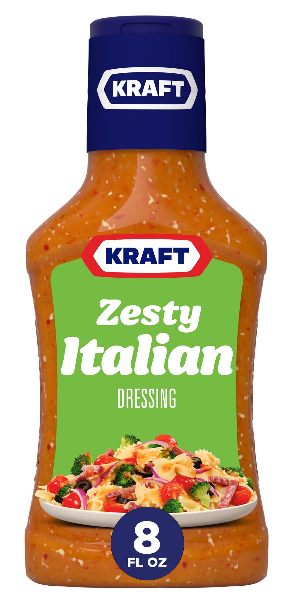 Kraft Zesty Italian Dressing adds deliciously zesty flavor to almost anything. Bursting with tangy vinegar and dried red bell peppers, our family favorite Italian dressing delivers Italian flavor in every bite. Pre-mixed for convenience, our dressing is ready to enjoy after a quick shake. With no high-fructose corn syrup and 60 calories per serving, you'll feel good about adding our zesty dressing to salad mix, pasta salads, sandwiches and all your favorite appetizers and entrees. Our 8 fluid ounce squeezable dressing bottle comes with a convenient applicator top so you can add the perfect amount to all your favorite dishes.