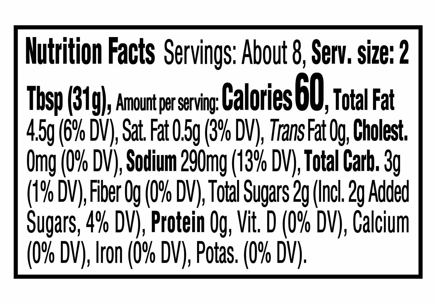 Ingredients: Vinegar Water Blend of Vegetable Oils (Soybean Oil Canola Oil) Sugar Salt Garlic (Dried) Contains Less Than 2% of Red Bell Peppers (Dried) Onions (Dried) Xanthan Gum Spice Oleoresin Paprika (Color) Potassium Sorbate and Calcium Disodium EDTA (to Protect Flavor). Contains: Soybeans