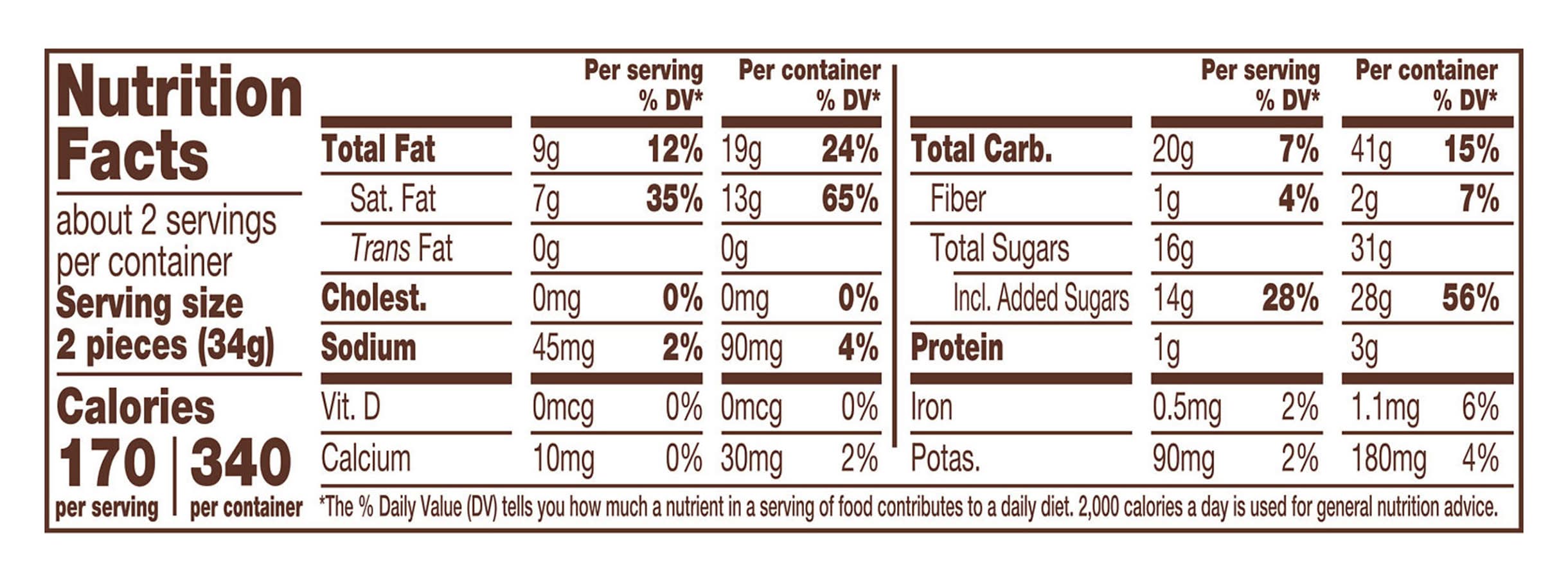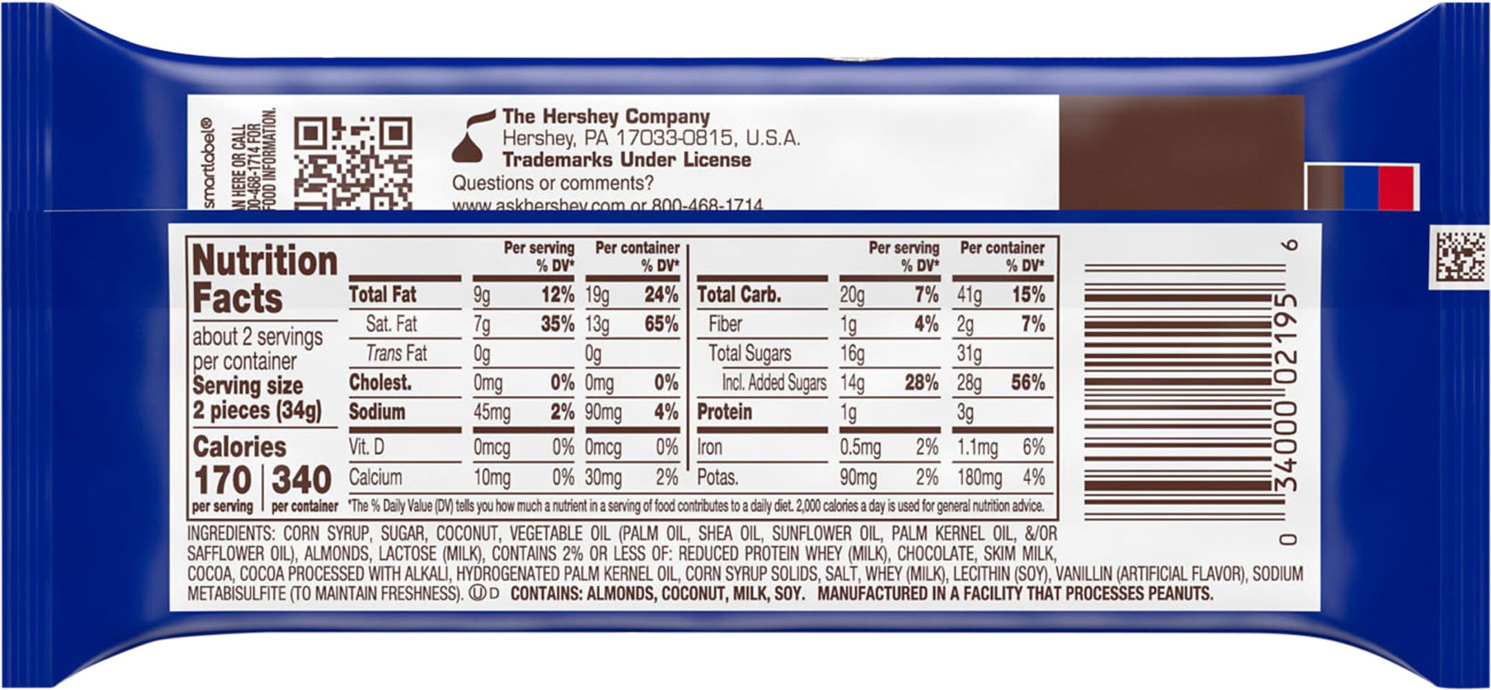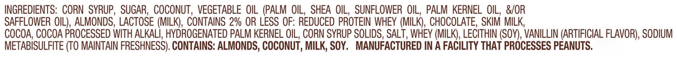 Ingredients: Corn Syrup, Sugar, Coconut, Vegetable Oil (Palm Oil, Shea Oil, Sunflower Oil, Palm Kernel Oil, &/or Safflower Oil), Almonds, Lactose (Milk), Contains 2% or Less of: Reduced Protein Whey (Milk), Chocolate, Skim Milk, Cocoa, Cocoa Processed with Alkali, Hydrogenated Palm Kernel Oil, Corn Syrup Solids, Salt, Whey (Milk), Lecithin (Soy), Vanillin (Artificial Flavor), Sodium Metabisulfite (to Maintain Freshness) Contains: Tree Nuts, Almonds, Tree Nuts, Coconuts, Lactose, Soybeans, Milk, Sulfites, Peanuts