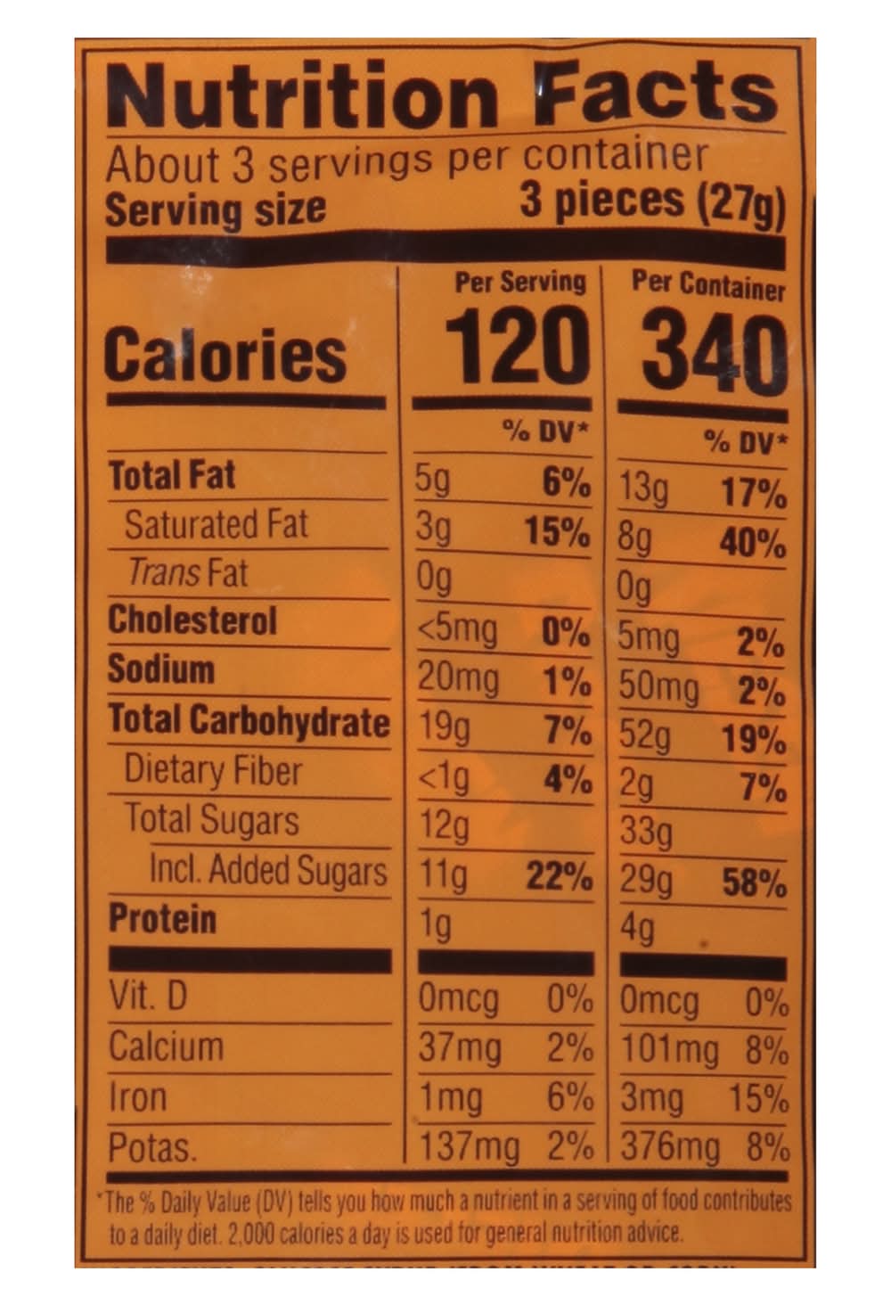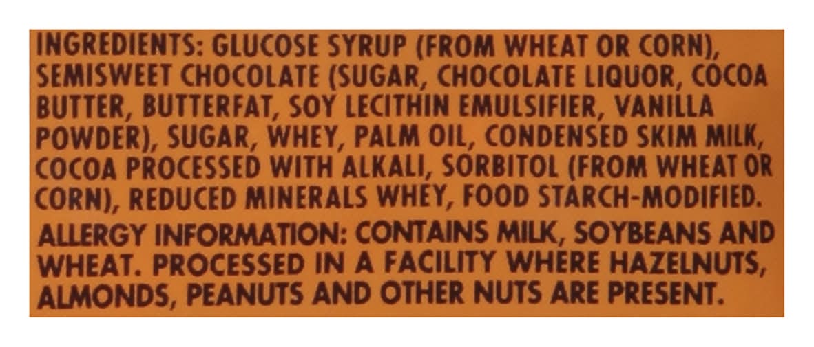 Ingredients: Glucose Syrup (from Wheat or Corn), Semisweet Chocolate (Sugar, Chocolate Liquor, Cocoa Butter, Butterfat, Soy Lecithin Emulsifier, Vanilla Powder), Sugar, Whey, Palm Oil, Condensed Skim Milk, Cocoa Processed with Alkali, Sorbitol (from Wheat or Corn), Reduced Minerals Whey, Food Starch-Modified Contains: Milk, Soybeans, Wheat, Tree Nuts, Hazelnuts/Filberts, Tree Nuts, Almonds, Peanuts, Tree Nuts, Corn