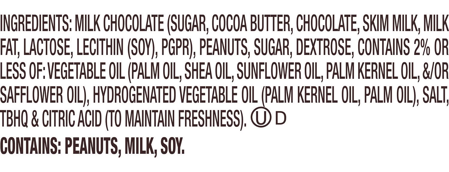 Ingredients: SUGAR, VEGETABLE OIL (PALM OIL, SHEA OIL, SUNFLOWER OIL, PALM KERNEL OIL, /OR SAFFLOWER OIL), PEANUTS, LACTOSE (MILK), REDUCED PROTEIN WHEY (MILK), CHOCOLATE, SKIM MILK, CONTAINS 2% OR LESS OF: DEXTROSE, COCOA, COCOA PROCESSED WITH ALKALI, HYDROGENATED VEGETABLE OIL (PALM KERNEL OIL, PALM OIL), LECITHIN (SOY), SALT, VANILLIN (ARTIFICIAL FLAVOR), TBHQ CITRIC ACID (TO MAINTAIN FRESHNESS). Contains: Contains: Peanuts, Soy, Milk