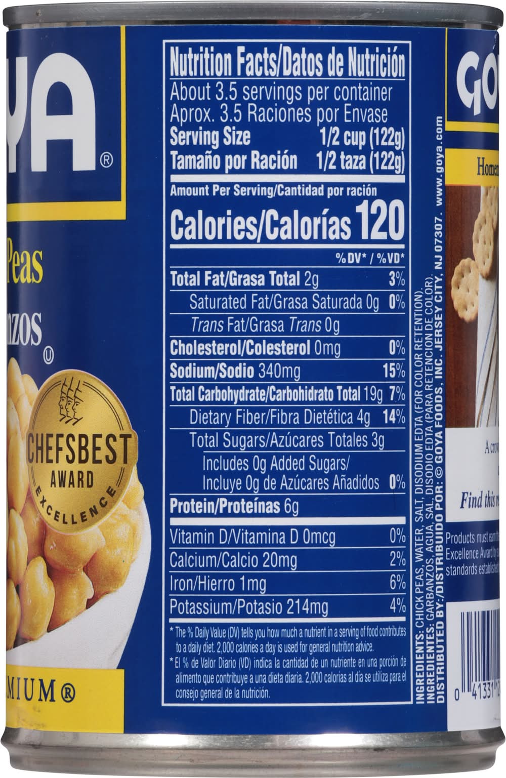 Goya Chick Peas are great for making homemade hummus, garnishing salads, and eating on their own as a side! These 15.5-oz. cans are an excellent way to add protein and fiber to your diet. Ideal for school cafeterias, church kitchens, restaurants, and use at home!PROP 65 BPA Many cans containing foods and beverages sold here have epoxy linings used to avoid microbial contamination and to extend shelf life. Lids on jars and caps on bottles may also have epoxy linings. Some of these linings can leach small amounts of bisphenol A (BPA) into the food or beverage. BPA is a chemical known to the State of California to cause harm to the female reproductive system. For more information go to: www.P65Warnings.ca.gov/BPA Goya foods, inc., Secaucus, Nj 07096.