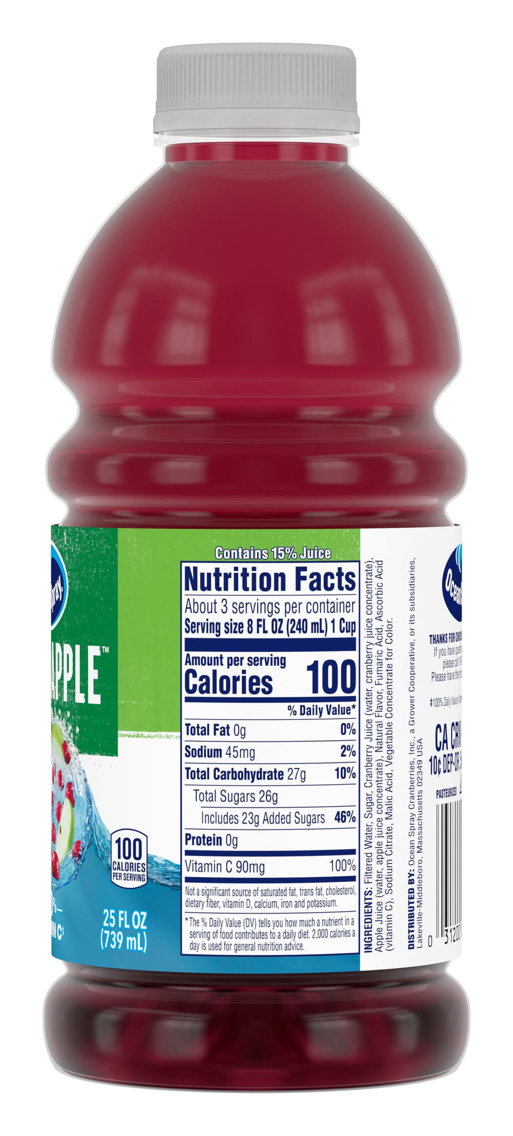 Ingredients: Filtered Water, Sugar, Cranberry Juice (Water, Cranberry Juice Concentrate), Apple Juice (Water, Apple Juice Concentrate), Natural Flavor, Fumaric Acid, Sodium Citrate, Malic Acid, Ascorbic Acid (Vitamin C), Vegetable Concentrate for Color.