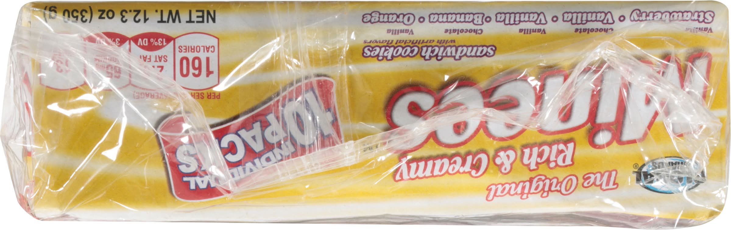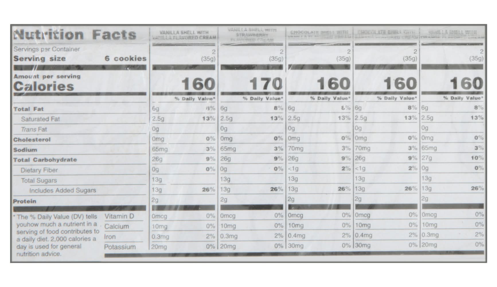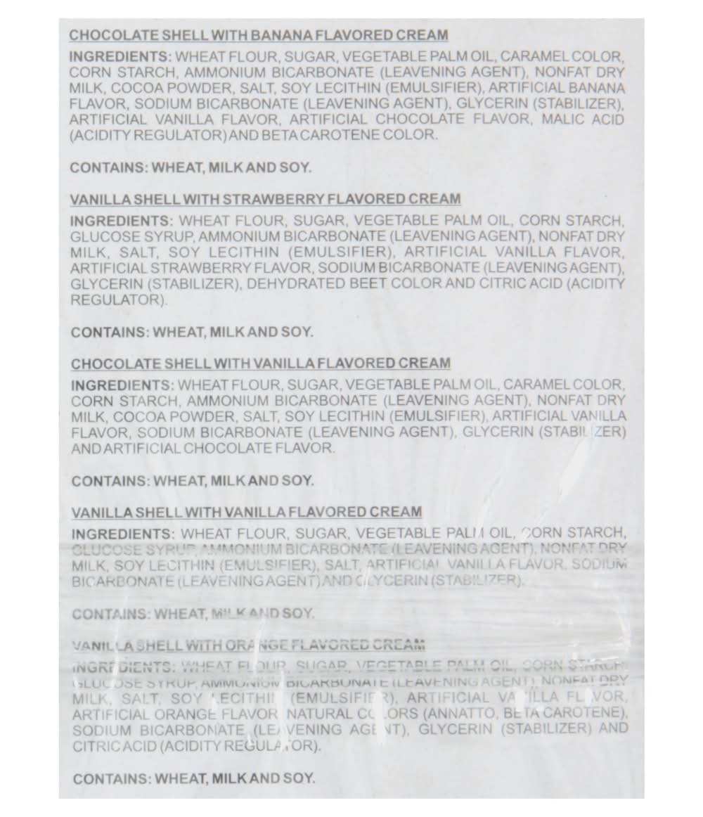 Ingredients: Vanilla Shell with Vanilla Flavored Cream: Vanilla Shell with Vanilla Flavored Cream Ingredients: Wheat Flour, Sugar, Vegetable Palm Oil, Corn Starch, Glucose Syrup, Ammonium Bicarbonate (Leavening Agent), Nonfat Dry Milk, Soy Lecithin (Emulsifier), Salt, Artificial Vanilla Flavor, Sodium Bicarbonate (Leavening Agent) and Glycerin (Stabilizer). Vanilla Shell with Strawberry Flavored Cream: Vanilla Shell with Strawberry Flavored Cream Ingredients: Wheat Flour, Sugar, Vegetable Palm Oil, Corn Starch, Glucose Syrup, Ammonium Bicarbonate (Leavening Agent), Nonfat Dry Milk, Salt, Soy Lecithin (Emulsifier), Artificial Vanilla Flavor, Artificial Strawberry Flavor, Sodium Bicarbonate (Leavening Agent), Glycerin (Stabilizer), Dehydrated Beet Color and Citric Acid (Acidity Regulator). Chocolate Shell with Vanilla Flavored Cream: Chocolate Shell with Vanilla Flavored Cream Ingredients: Wheat Flour, Sugar, Vegetable Palm Oil, Caramel Color, Corn Starch, Ammonium Bicarbonate (Leavening Agent), Nonfat Dry Milk, Cocoa Powder, Salt, Soy Lecithin (Emulsifier), Artificial Vanilla Flavor, Sodium Bicarbonate (Leavening Agent), Glycerin (Stabilizer) and Artificial Chocolate Flavor. Chocolate Shell with Banana Flavored Cream: Chocolate Shell with Banana Flavored Cream Ingredients: Wheat Flour, Sugar, Vegetable Palm Oil, Caramel Color, Corn Starch, Ammonium Bicarbonate (Leavening Agent), Nonfat Dry Milk, Cocoa Powder, Salt, Soy Lecithin (Emulsifier) Artificial Banana Flavor, Sodium Bicarbonate (Leavening Agent), Glycerin (Stabilizer), Artificial Vanilla Flavor, Artificial Chocolate Flavor, Malic Acid (Acidity Regulator) and Beta Carotene Color. Vanilla Shell with Orange Flavored Cream: Vanilla Shell with Orange Flavored Cream Ingredients: Wheat Flour, Sugar, Vegetable Palm Oil, Corn Starch, Glucose Syrup, Ammonium Bicarbonate (Leavening Agent), Nonfat Dry Milk, Salt, Soy Lecithin (Emulsifier), Artificial Vanilla Flavor, Artificial Orange Flavor, Natural Colors (Annatto, Beta Carotene), Sodium Bicarbonate (Leavening Agent), Glycerin (Stabilizer) and Citric Acid (Acidity Regulator). Contains: Wheat, Milk, Soybeans