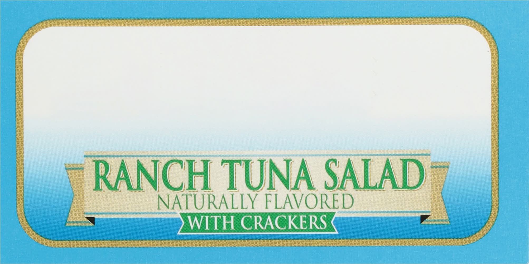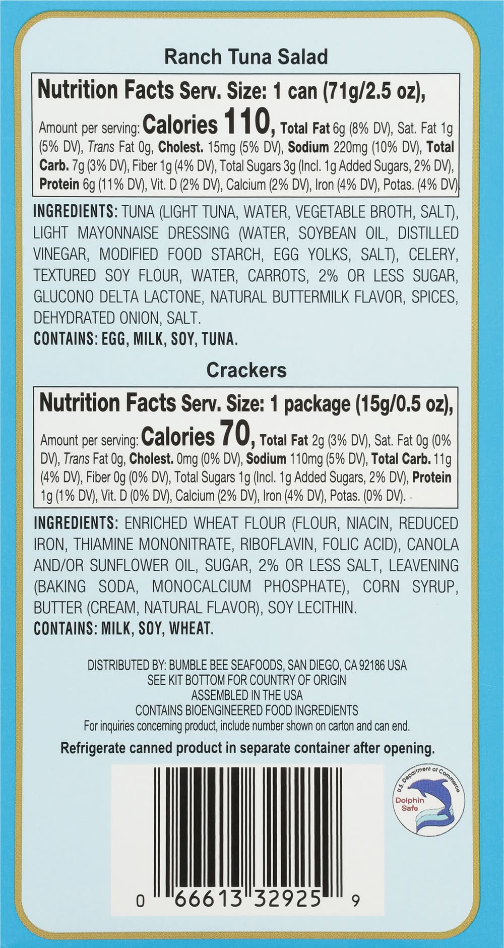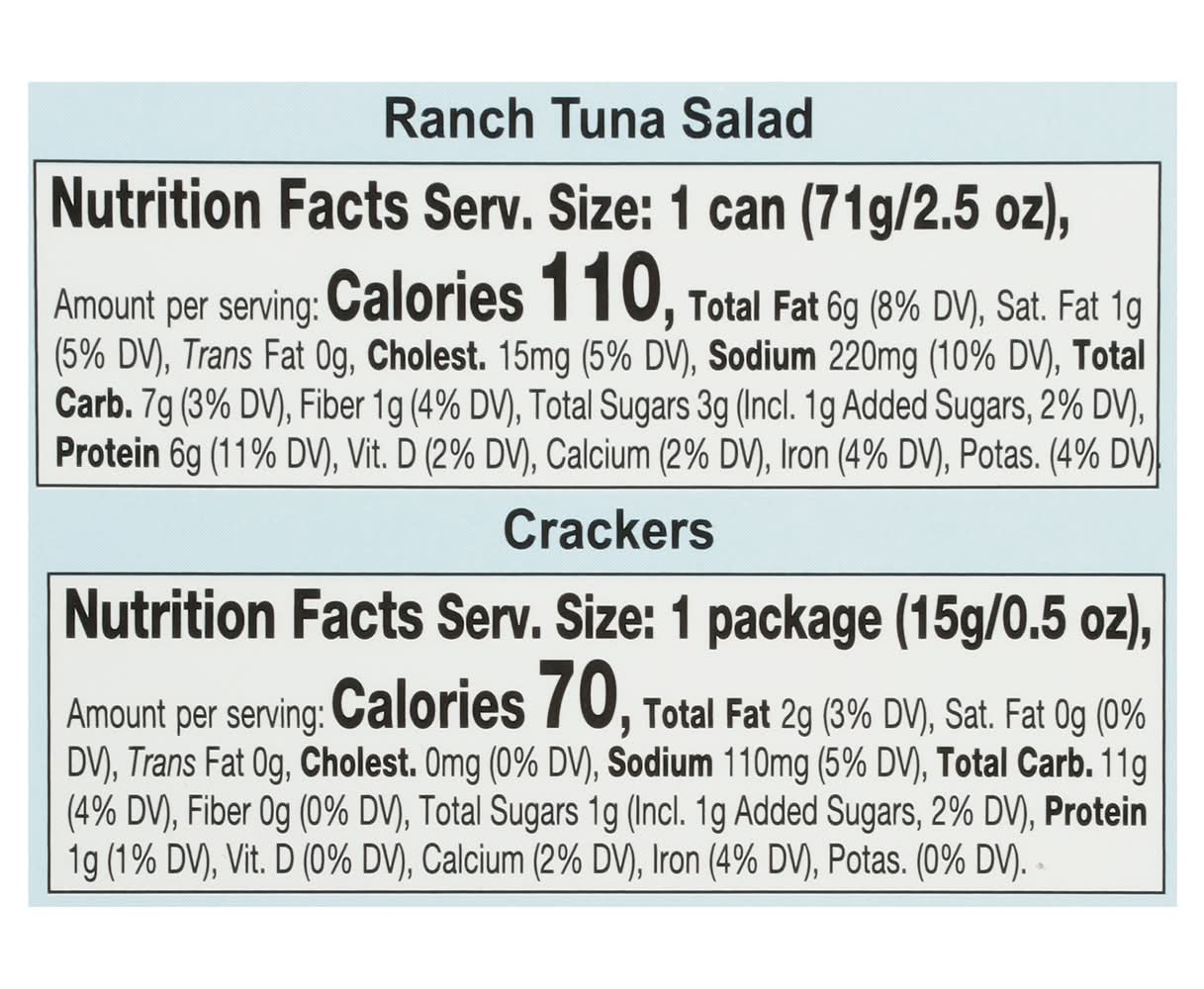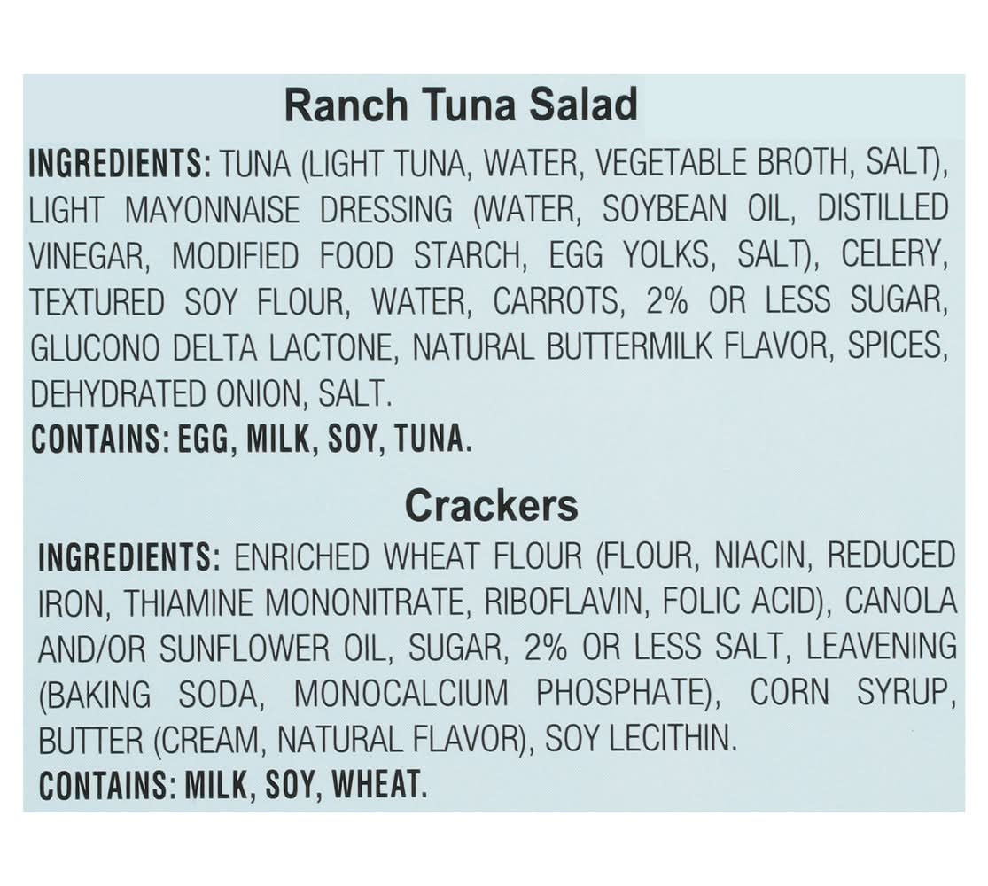 Ingredients: Ranch Tuna Salad: Tuna (Light Tuna, Water, Vegetable Broth, Salt), Light Mayonnaise Dressing (Water, Soybean Oil, Distilled Vinegar, Modified Food Starch, Egg Yolks, Salt), Celery, Textured Soy Flour, Water, Carrots, 2% or Less Sugar, Glucono Delta Lactone, Natural Buttermilk Flavor, Spices, Dehydrated Onion, Salt. Crackers: Enriched Wheat Flour (Flour, Niacin, Reduced Iron, Thiamine Mononitrate, Riboflavin, Folic Acid), Canola and/or Sunflower Oil, Sugar, 2% or Less Salt, Leavening (Baking Soda, Monocalcium Phosphate), Corn Syrup, Butter (Cream, Natural Flavor), Soy Lecithin. Contains: Eggs, Milk, Soybeans, Fish, Tuna, Celery, Wheat, Corn