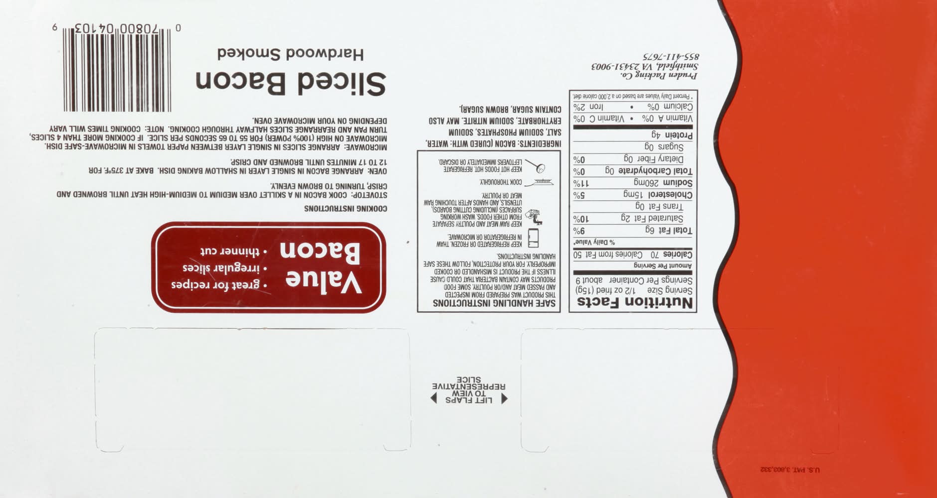 Bacon, Hardwood Smoked, Sliced • Number of servings: 9 • Pruden Packing Co., Smithfield, VA, 23431-9003