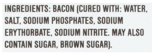 Ingredients: Bacon (Cured with: Water, Salt, Sodium Phosphates, Sodium Erythorbate, Sodium Nitrite. May Also Contain Sugar, Brown Sugar)