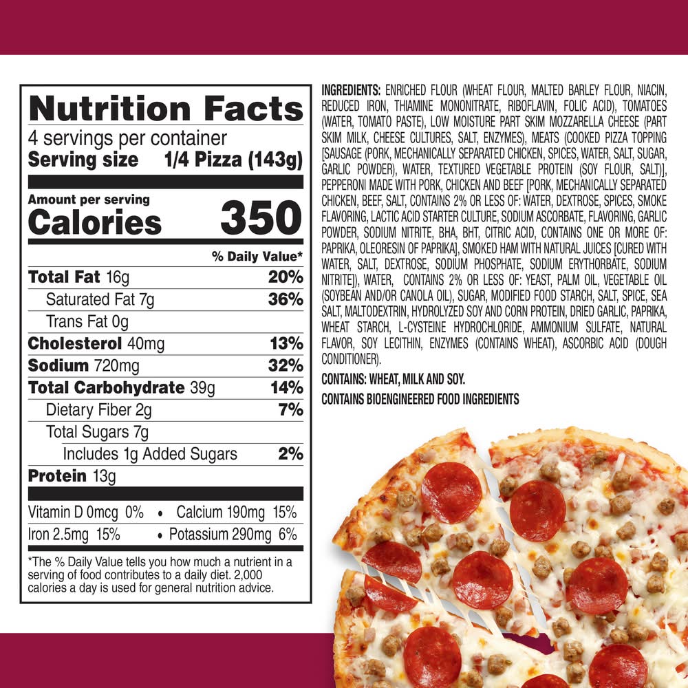 Ingredients: Enriched Flour (Wheat Flour, Malted Barley Flour, Niacin, Reduced Iron, Thiamine Mononitrate, Riboflavin, Folic Acid), Tomatoes (Water, Tomato Paste), Low Moisture Part Skim Mozzarella Cheese (Cultured Pasteurized Part Skim Milk, Salt, Enzymes), Cooked Pizza Topping (Sausage [Pork, Mechanically Separated Chicken, Spices, Water, Salt, Sugar, Garlic Powder], Water, Textured Vegetable Protein [Soy Flour, Salt]), Water, Pepperoni made with Pork, Chicken and Beef (Pork, Mechanically Separated Chicken, Beef, Salt, contains 2% or less of: Water, Dextrose, Spices, Smoke Flavoring, Lactic Acid Starter Culture, Sodium Ascorbate, Flavoring, Garlic Powder, Sodium Nitrite, BHA, BHT, Citric Acid, contains one or more of: Paprika, Oleoresin of Paprika), Smoked Ham with Natural Juices (Cured with Water, Salt, Dextrose, Sodium Phosphate, Sodium Erythorbate, Sodium Nitrite), Contains 2% or less of: Yeast, Palm Oil, Vegetable Oil (Soybean and/or Canola Oil), Sugar, Modified Food Starch, Salt, Spice, Sea Salt, Maltodextrin, Hydrolyzed Soy and Corn Protein, Dried Garlic, Paprika, Wheat Starch, L-Cysteine Hydrochloride, Ammonium Sulfate, Natural Flavor, Soy Lecithin, Enzymes (contains Wheat), Ascorbic Acid (dough conditioner) Contains: Milk, Wheat, Soy