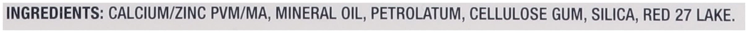 Ingredients: Calcium/Zinc PVM/MA, Mineral Oil, Petrolatum, Cellulose Gum, Silica, Red 27 Lake