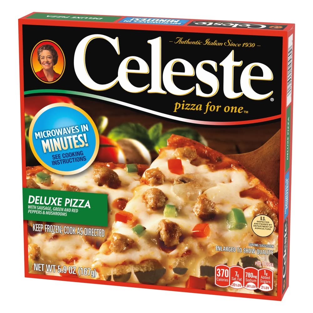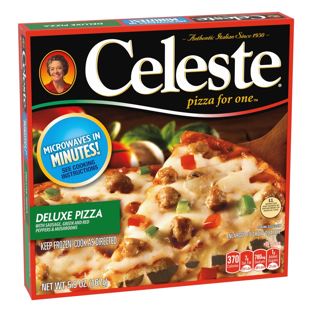 When you are craving a delicious deluxe pizza, try Celeste Deluxe Pizza for One, Individual Microwavable Frozen Pizza. Tasty thin crust, topped with savory sauce, gooey cheese, sausage, green and red peppers, and mushrooms for homemade-quality pizza the whole family will love. This microwave meal cooks in 2 minutes so it is perfect for a quick lunch, dinner or anytime meal. Celeste: Authentic Italian Since 1930.
