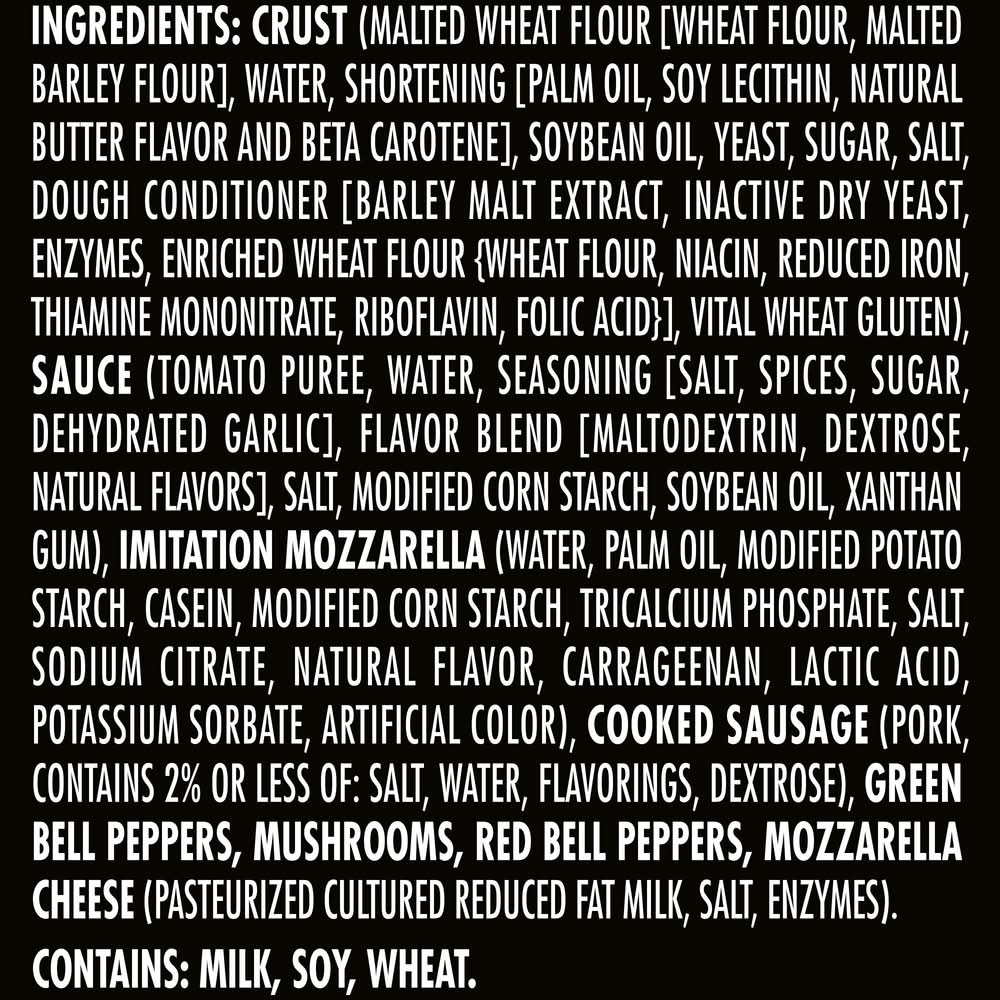 Ingredients: INGREDIENTS: CRUST, MALTED WHEAT FLOUR (MALTED BARLEY FLOUR), WATER, SHORTENING FLAKE (PALM OIL, SOY LECITHIN, NATURAL BUTTER FLAVOR AND BETA CAROTENE), YEAST, CORN STARCH, SOYBEAN OIL, SUGAR, SALT, DOUGH CONDITIONER (MALT EXTRACT, INACTIVE YEAST, ENZYMES, ENRICHED WHEAT FLOUR [WHEAT FLOUR, NIACIN, REDUCED IRON, THIAMINE MONONITRATE, RIBOFLAVIN, FOLIC ACID]), VITAL WHEAT GLUTEN, TOPPING, IMITATION MOZZARELLA BLEND (WATER, PALM OIL, MODIFIED POTATO STARCH, RENNET CASEIN, MODIFIED CORN STARCH, SODIUM CITRATE, SALT, SODIUM PHOSPHATE, NATURAL FLAVOR, CARRAGEENAN, LACTIC ACID, ARTIFICIAL COLOR), MOZZARELLA (PASTEURIZED CULTURED REDUCED FAT MILK, SALT, ENZYMES), COOKED SAUSAGE MADE WITH PORK- CHICKEN ADDED, PORK, MECHANICALLY SEPARATED CHICKEN, WATER, SEASONINGS (SPICES, SALT, DEXTROSE, PAPRIKA, BHT, TBHQ, CITRIC ACID), DICED GREEN BELL PEPPERS, MUSHROOMS, RED BELL PEPPERS, SAUCE, WATER, TOMATO PUREE [WATER, TOMATO PASTE], SEASONING (SALT, SPICES, SUGAR, DEHYDRATED GARLIC), FLAVOR BLEND (MALTODEXTRIN, DEXTROSE, NATURAL SPICE OLEORESINS), SALT, MODIFIED CORN STARCH, SOYBEAN OIL, XANTHAN GUM, . Contains: Milk, Soy, Wheat