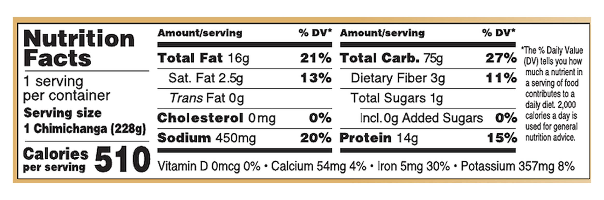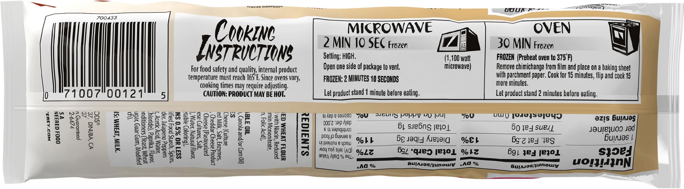 Directions for use: Microwave: 2 min 10 sec Frozen. Setting: High. Open one side of package to vent. Frozen: 2 Minutes 10 seconds. Let product stand 1 minute before eating. (1.100 watt microwave). 30 Min frozen. Frozen (Preheat oven to 375 degrees F). Remove chimichanga from film and place on a baking sheet with parchment paper. Cook for 15 minutes, flip and cook 15 more minutes. Let product stand 2 minutes before eating. For food safety and quality, internal product temperature must reach 165 degrees F. Since ovens vary, cooking times may require adjusting. Caution: Product may be hot. Keep frozen. Storage recommendation: Keep frozen.