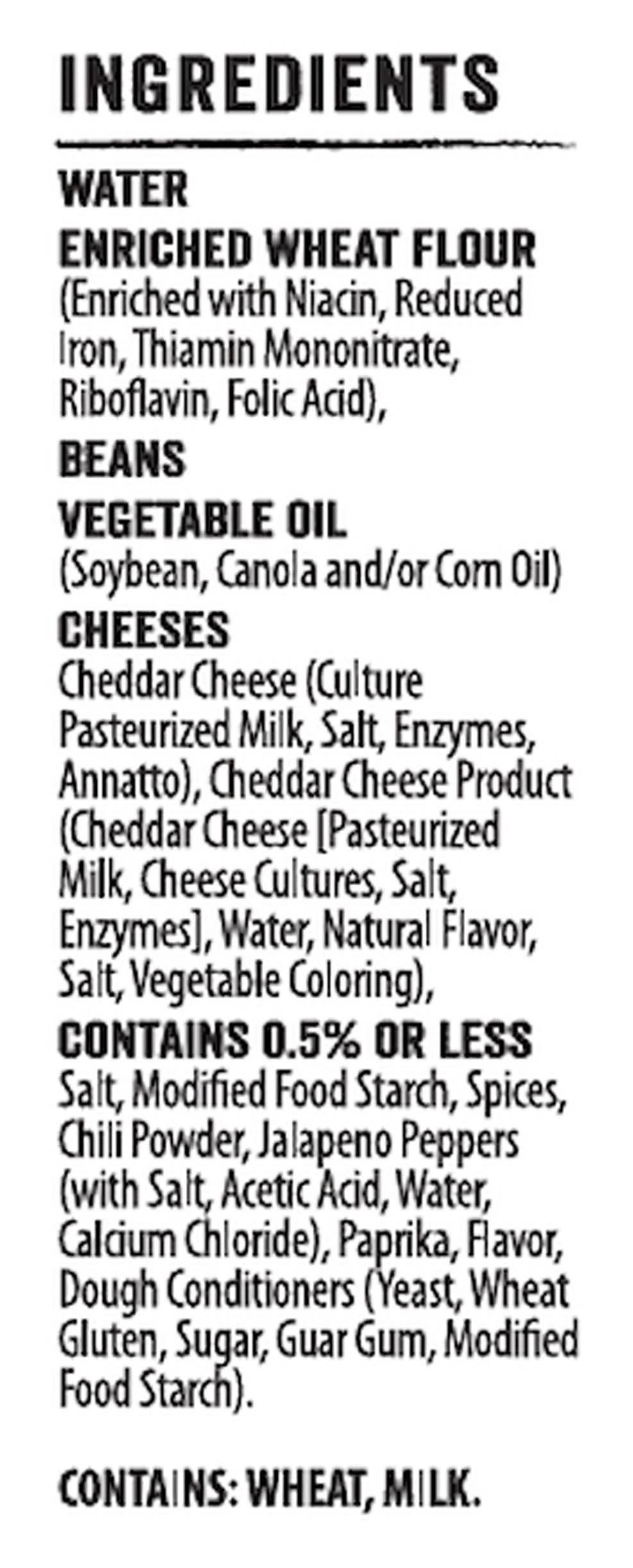 Ingredients: Water, Enriched Wheat Flour (Enriched with Niacin, Reduced Iron, Thiamin Mononitrate, Riboflavin, Folic Acid), Beans, Vegetable Oil (Soybean, Canola and/or Corn Oil), Cheeses Cheddar Cheese (Culture Pasteurized Milk, Salt, Enzymes, Annatto), Cheddar Cheese Product (Cheddar Cheese [Pasteurized Milk, Cheese Cultures, Salt, Enzymes], Water, Natural Flavor, Salt, Vegetable Coloring), Contains 0.5% or Less Salt, Modified Food Starch, Spices, Chili Powder, Jalapeno Peppers (with Salt, Acetic Acid, Water, Calcium Chloride), Paprika, Flavor, Dough Conditioners (Yeast, Wheat Gluten, Sugar, Guar Gum, Modified Food Starch) Contains: Wheat, Milk, Gluten, Soybeans