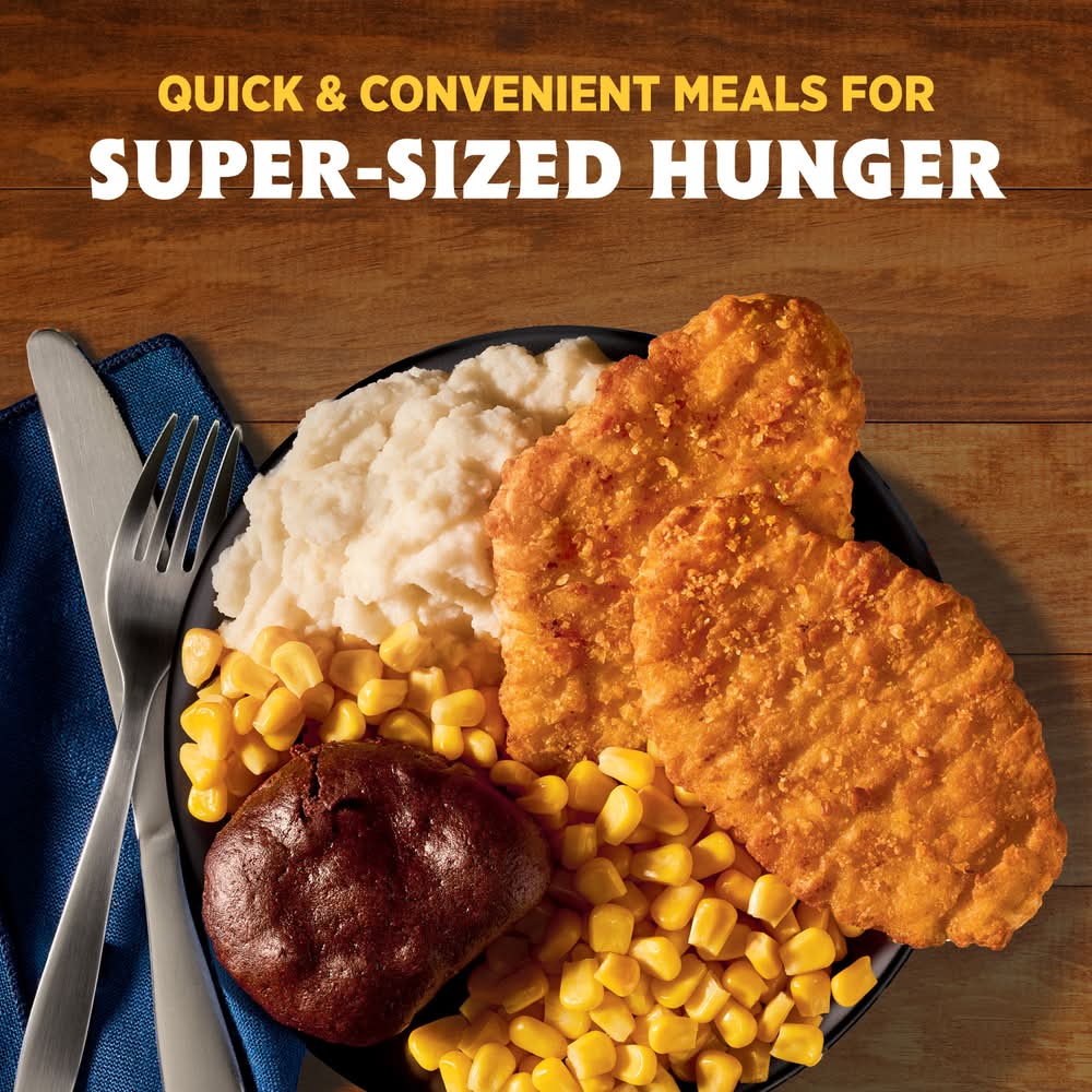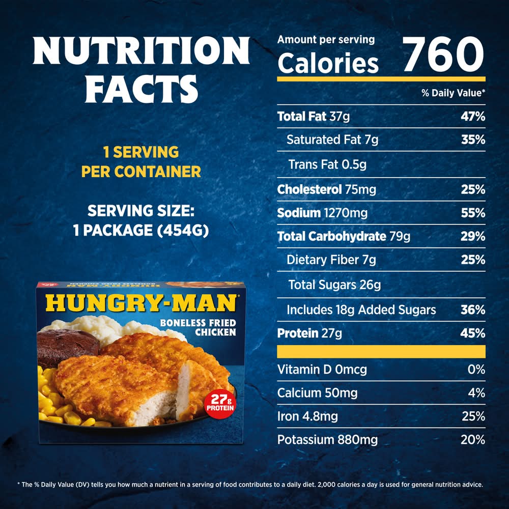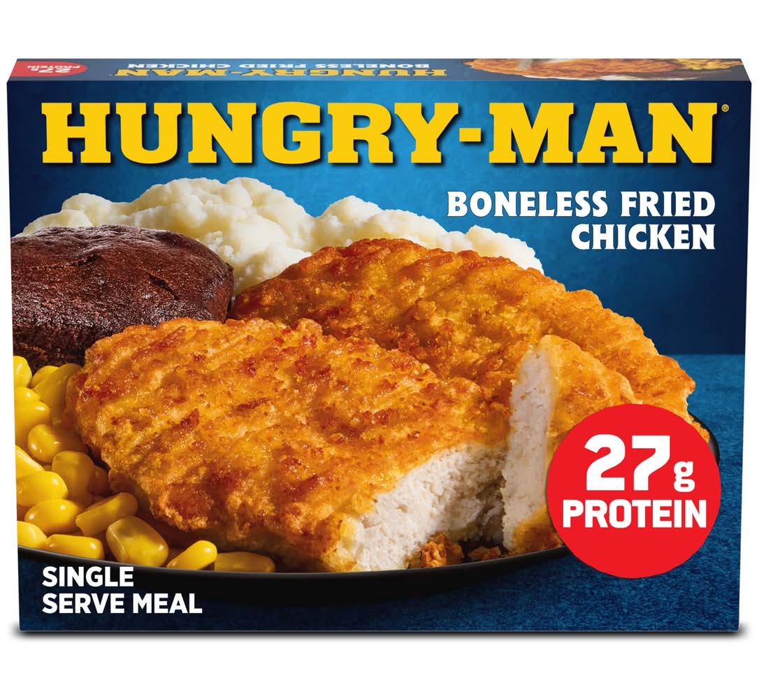 Make mealtime easy and satisfy your comfort food cravings with Hungry-Man Boneless Fried Chicken. Enjoy a complete frozen meal featuring tender white meat chicken patties, home-style mashed potatoes and sweet corn side dishes, and a rich chocolate brownie dessert. With 27 grams of protein per serving, this frozen food offers a classic homestyle flavor for satisfying frozen entrees that are ready to eat anytime hunger strikes. Whether you're looking for convenient lunches to bring to work, a hearty TV dinner or easy meals that are ready to eat in minutes, Hungry-Man microwave meals are a great choice to tackle those tummy rumbles. Simply follow the instructions on the package to microwave or prepare these quick meals in a conventional oven. Each package contains one full meal that is perfect for busy lifestyles and hearty appetites. Store the convenient frozen meals in your freezer until you're ready to enjoy. Try other Hungry-Man frozen meals to find your favorite. Hungry-Man offers big portions for big appetites. • Conagra Brands, PO Box 3534,Chicago,IL,60654 • Packaging: Reusable