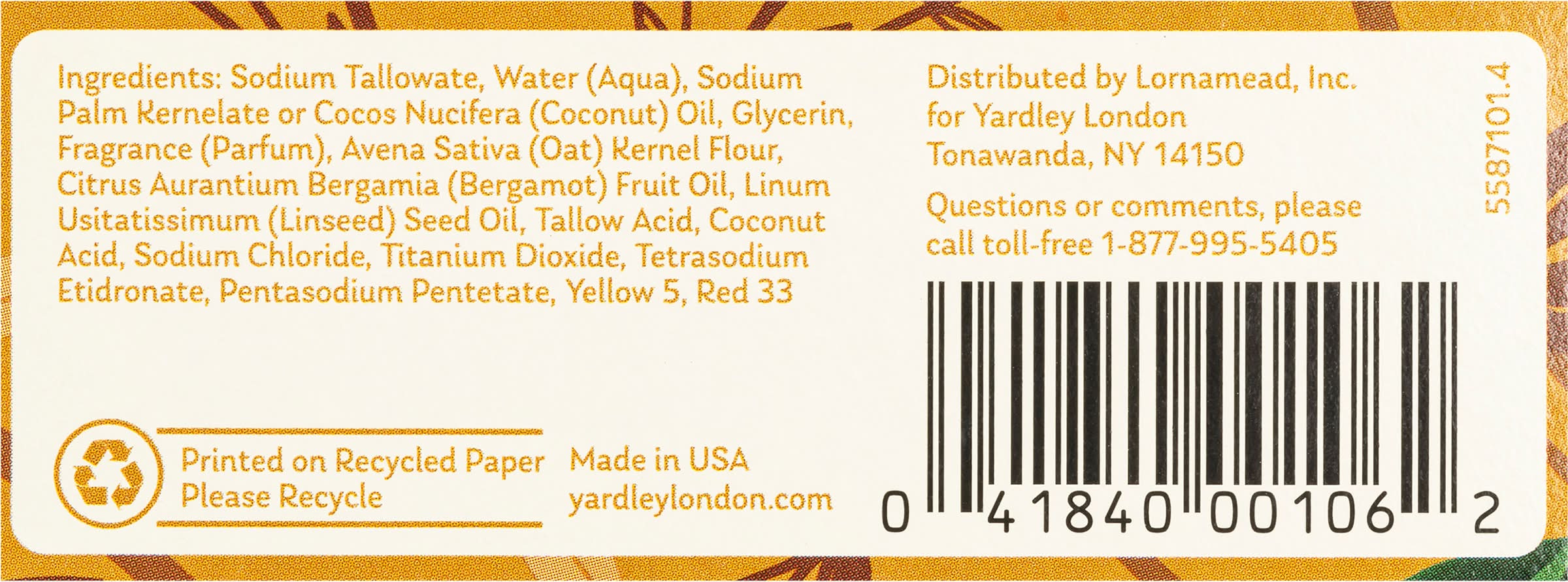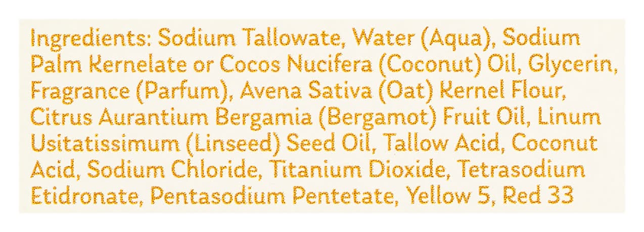 Ingredients: Sodium Tallowate, Water (Aqua), Sodium Palm Kernelate or Cocos Nucifera (Coconut) Oil, Glycerin, Fragrance (Parfum), Avena Sativa (Oat) Kernel Flour, Citrus Aurantium Bergamia (Bergamot) Fruit Oil, Linum Usitatissimum (Linseed) Seed Oil, Tallow Acid, Coconut Acid, Sodium Chloride, Titanium Dioxide, Tetrasodiurn Etidronate, Pentasodium Pentetate, Yellow 5, Red 33