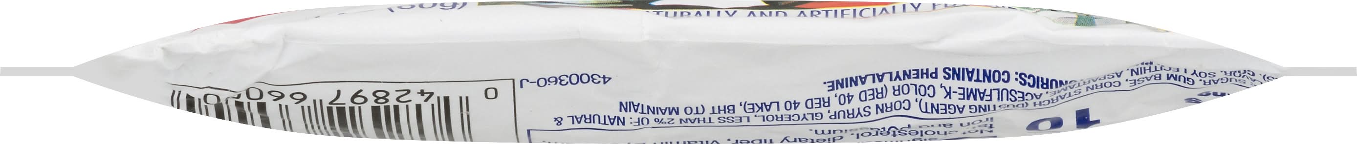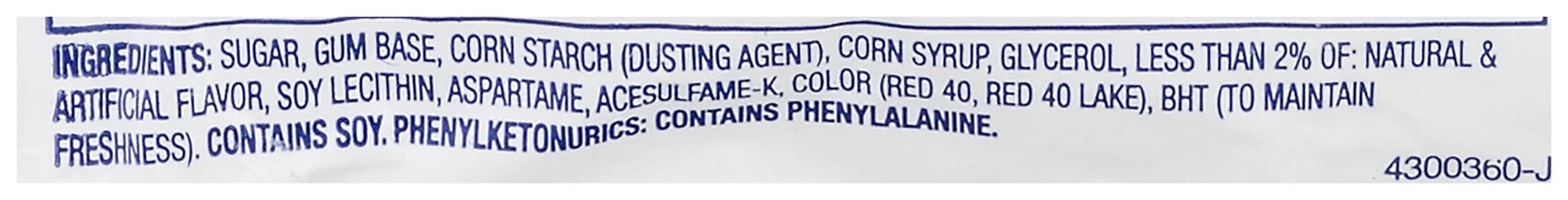 Ingredients: Sugar, Gum Base, Corn Starch (Dusting Agent), Corn Syrup, Glycerol, Less than 2% of: Natural & Artificial Flavor, Soy Lecithin, Acesulfame-K, Color (Red 40, Red 40 Lake), BHT (to Maintain Freshness) Contains: Soybeans