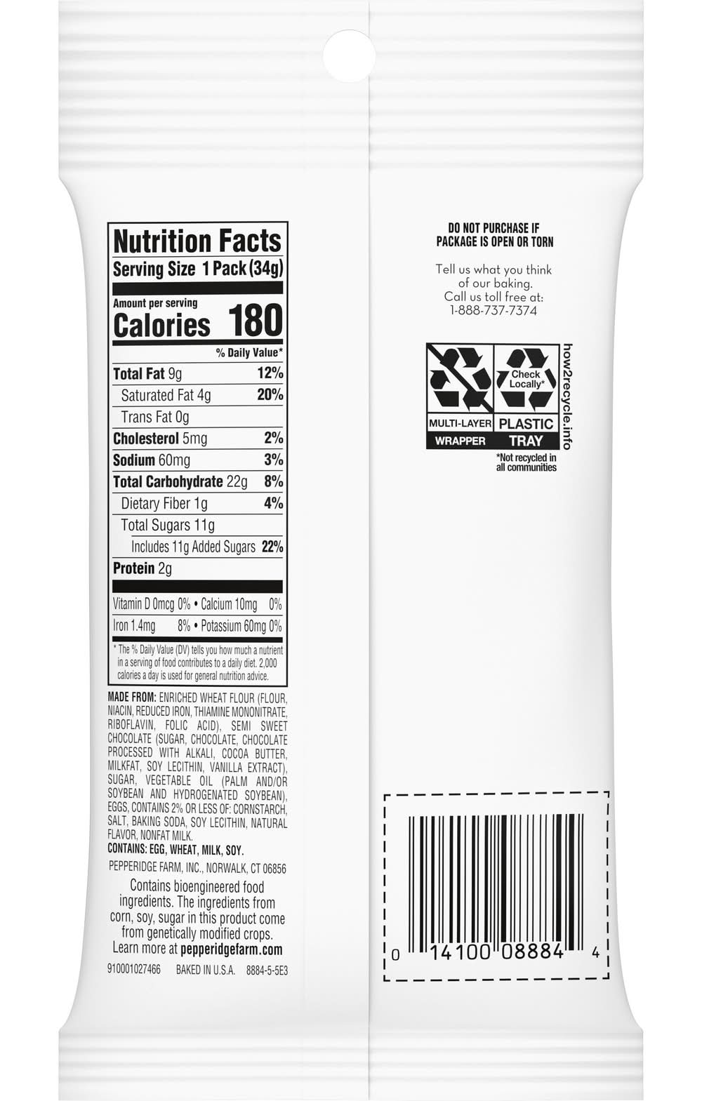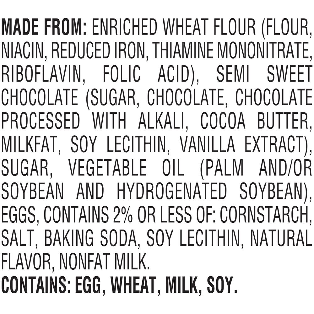 Ingredients: MADE FROM: ENRICHED WHEAT FLOUR (FLOUR, NIACIN, REDUCED IRON, THIAMINE MONONITRATE, RIBOFLAVIN, FOLIC ACID), SEMI SWEET CHOCOLATE (SUGAR, CHOCOLATE, CHOCOLATE PROCESSED WITH ALKALI, COCOA BUTTER, MILKFAT, SOY LECITHIN, VANILLA EXTRACT), SUGAR, VEGETABLE OIL (PALM AND/OR SOYBEAN AND HYDROGENATED SOYBEAN), EGGS, CONTAINS 2% OR LESS OF: CORNSTARCH, SALT, BAKING SODA, SOY LECITHIN, NATURAL FLAVOR, NONFAT MILK. CONTAINS: EGG, WHEAT, MILK, SOY. Contains: CONTAINS: Egg, Gluten, Milk/Dairy, Soybean, Wheat