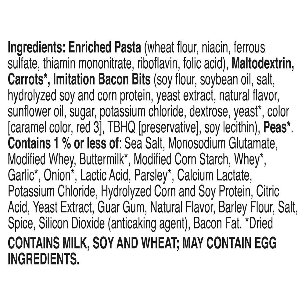 Ingredients: Enriched Pasta (Wheat Flour Niacin Ferrous Sulfate Thiamin Mononitrate Riboflavin Folic Acid), Maltodextrin, Carrots (Dried), Imitation Bacon Bits (Soy Flour Soybean Oil Salt Hydrolyzed Soy and Corn Protein Yeast Extract Natural Flavor Sunflower Oil Sugar Potassium Chloride Dextrose Yeast (Dried), Color [Caramel Color, Red 3], TBHQ [Preservative], Soy Lecithin), Peas (Dried), Contains 1 % or Less of: Sea Salt, Monosodium Glutamate, Modified Whey, Buttermilk (Dried), Modified Corn Starch, Whey (Dried), Garlic (Dried), Onion (Dried), Lactic Acid, Parsley (Dried), Calcium Lactate, Potassium Chloride, Hydrolyzed Corn and Soy Protein, Citric Acid, Yeast Extract, Guar Gum, Natural Flavor, Barley Flour, Salt, Spice, Silicon Dioxide (Anticaking Agent), Bacon Fat Contains: Wheat, Soybeans, Milk, Eggs