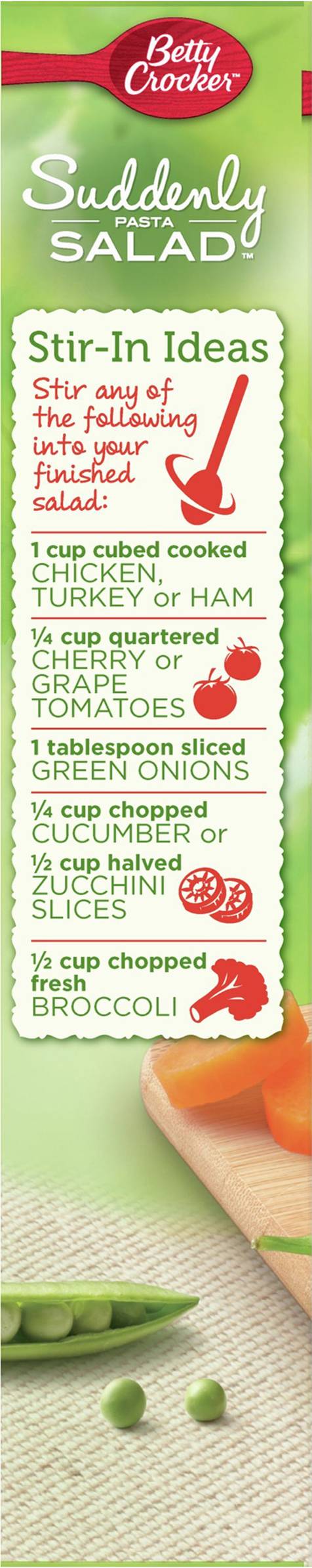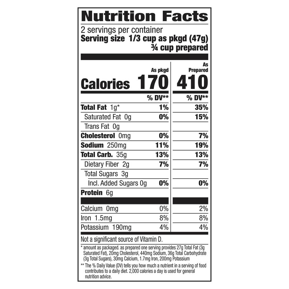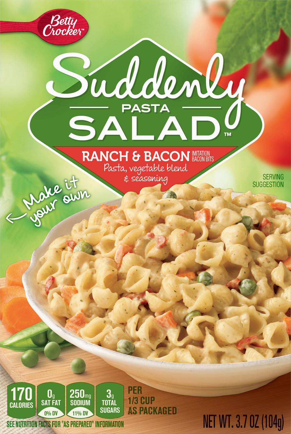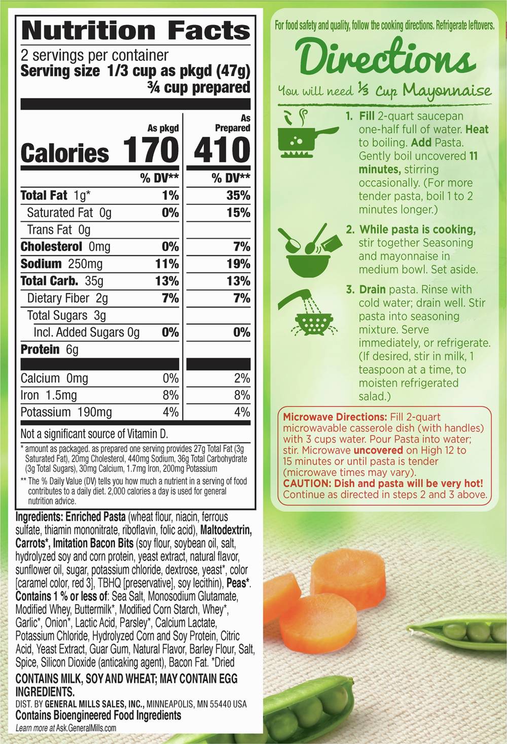 Pasta, vegetable blend & seasoning. Per 1/3 Cup as Packaged: 170 calories; 0 g sat fat (0% DV); 250 mg sodium (11% DV); 3 g total sugars. See nutrition facts for as prepared information. Contains bioengineered food ingredients. Learn more at Ask.GeneralMills.com. Immitation bacon bits. Make it your own. Tested & approved in the Betty Crocker kitchens. Each Betty Crocker product provides delicious homemade taste every time. www.BettyCrocker.com. how2recycle.info. 100% recycled paperboard. • Number of servings: 2 • General Mills Sales, Inc., Minneapolis, MN, 55440, Ph: 800-754-3516 • Packaging: Reusable