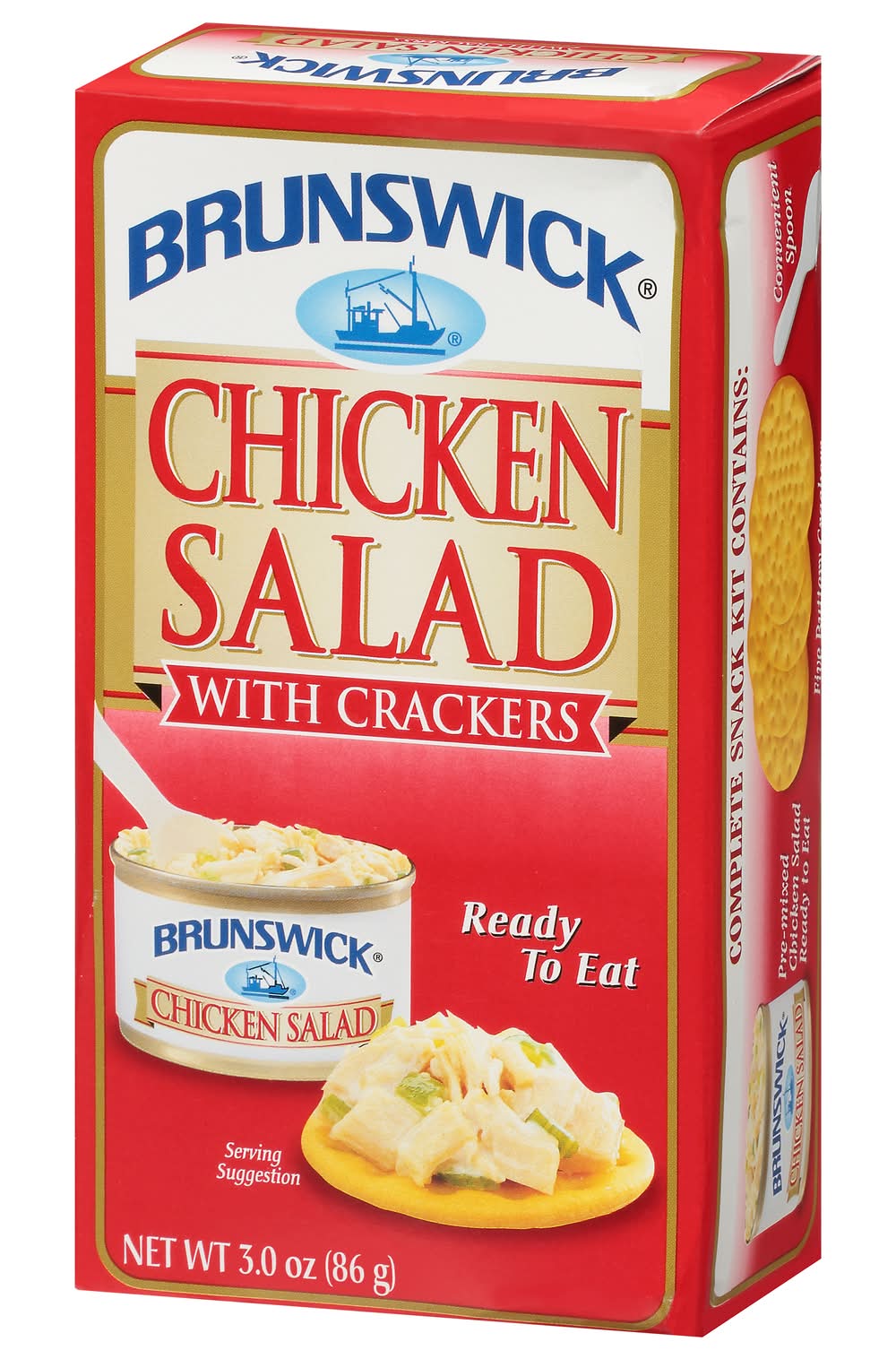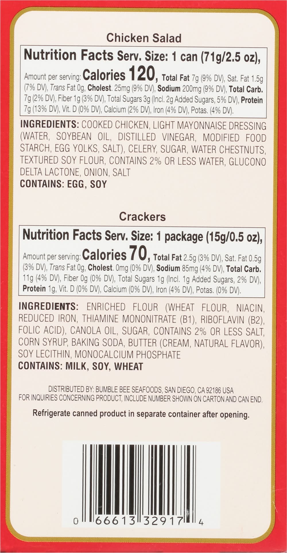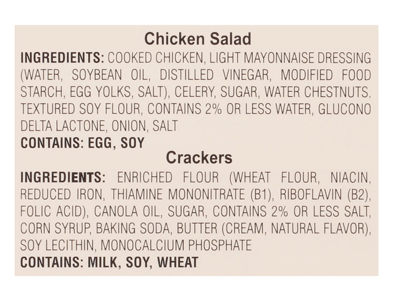 Ingredients: Chicken Salad: Cooked Chicken, Light Mayonnaise Dressing (Water, Soybean Oil, Distilled Vinegar, Modified Food Starch, Egg Yolks, Salt), Celery, Sugar, Water Chestnuts, Textured Soy Flour, Contains 2% or Less Water, Glucono Delta Lactone, Onion, Salt. Crackers: Enriched Flour (Wheat Flour, Niacin, Reduced Iron, Thiamine Mononitrate (B1), Riboflavin (B2), Folic Acid), Canola Oil, Sugar, Contains 2% or Less Salt, Corn Syrup, Baking Soda, Butter (Cream, Natural Flavor), Soy Lecithin, Monocalcium Phosphate. Contains: Eggs, Soybeans, Celery, Tree Nuts, Chestnuts, Milk, Wheat, Corn