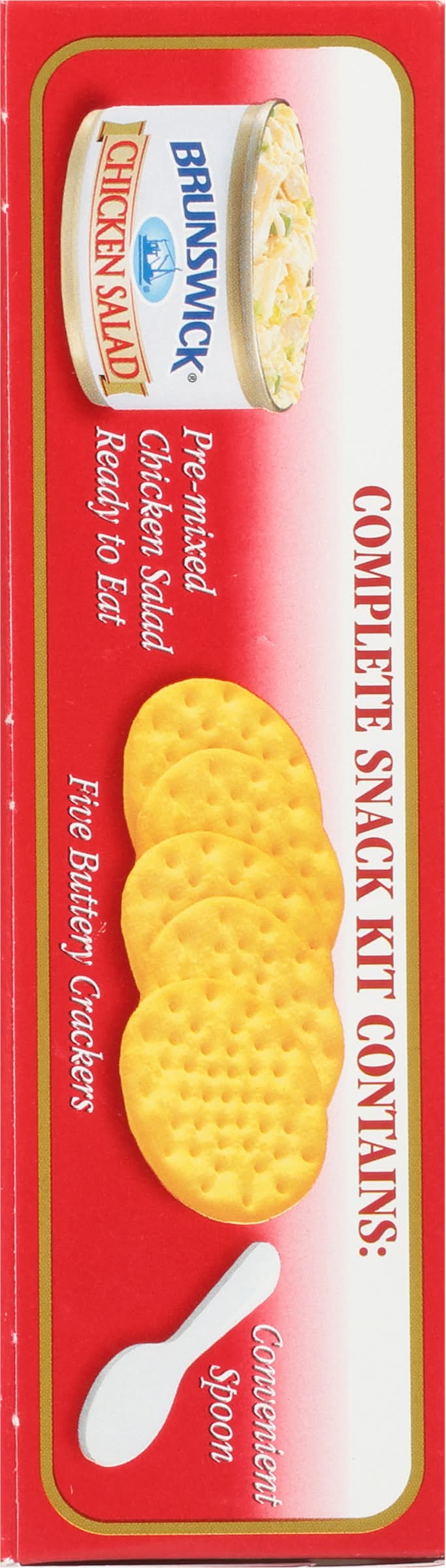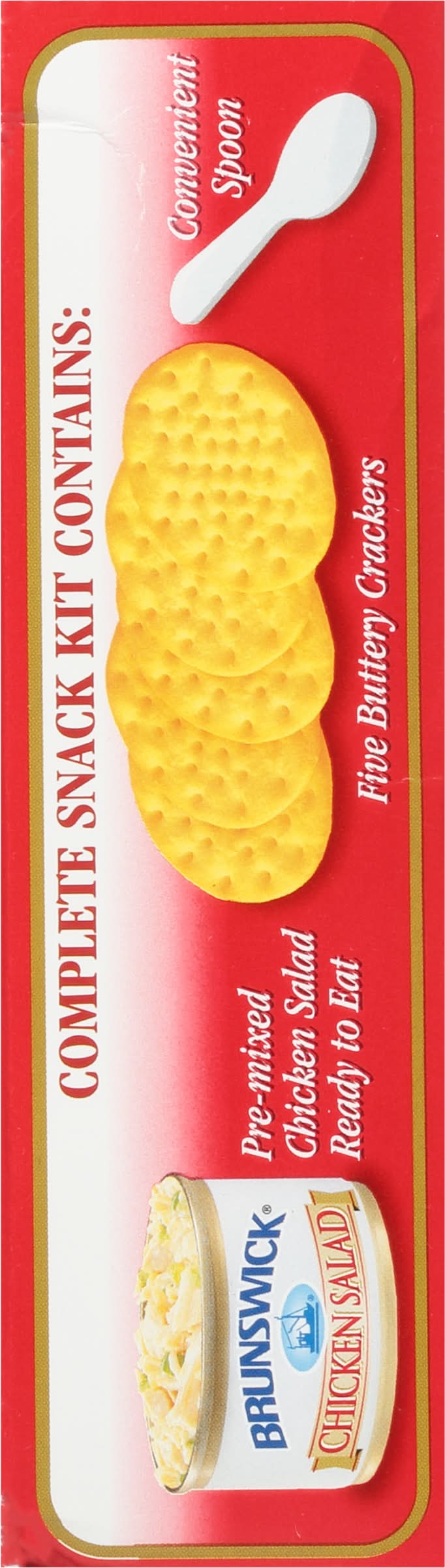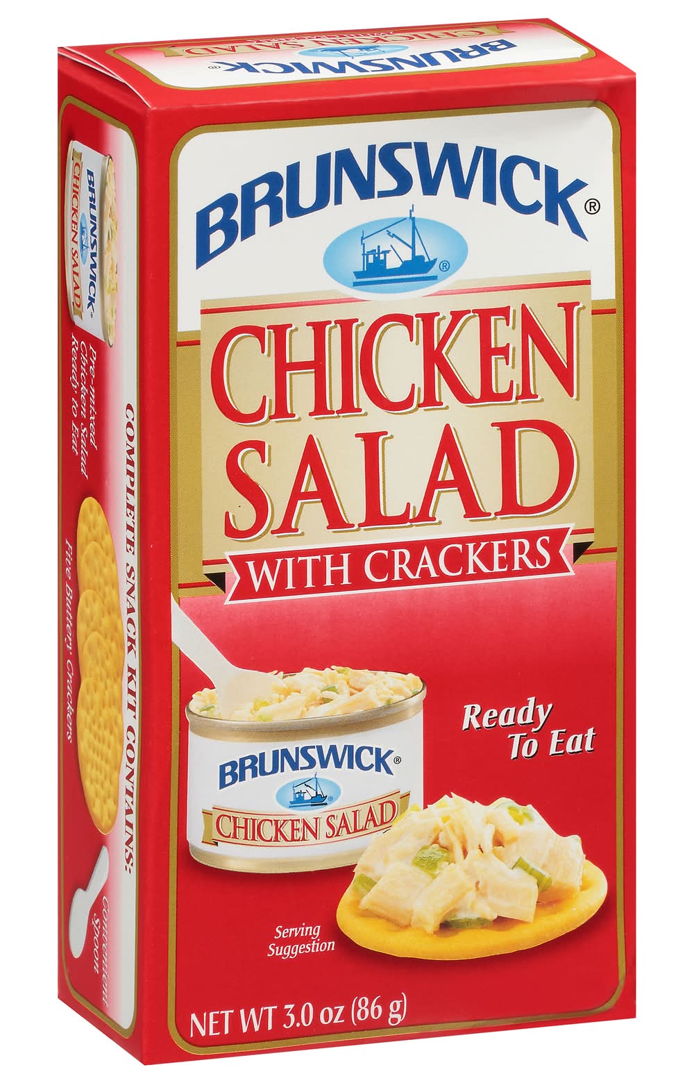 Ingredients: Chicken Salad: Cooked Chicken, Light Mayonnaise Dressing (Water, Soybean Oil, Distilled Vinegar, Modified Food Starch, Egg Yolks, Salt), Celery, Sugar, Water Chestnuts, Textured Soy Flour, Contains 2% or Less Water, Glucono Delta Lactone, Onion, Salt. Crackers: Enriched Flour (Wheat Flour, Niacin, Reduced Iron, Thiamine Mononitrate (B1), Riboflavin (B2), Folic Acid), Canola Oil, Sugar, Contains 2% or Less Salt, Corn Syrup, Baking Soda, Butter (Cream, Natural Flavor), Soy Lecithin, Monocalcium Phosphate. Contains: Eggs, Soybeans, Celery, Tree Nuts, Chestnuts, Milk, Wheat, Corn