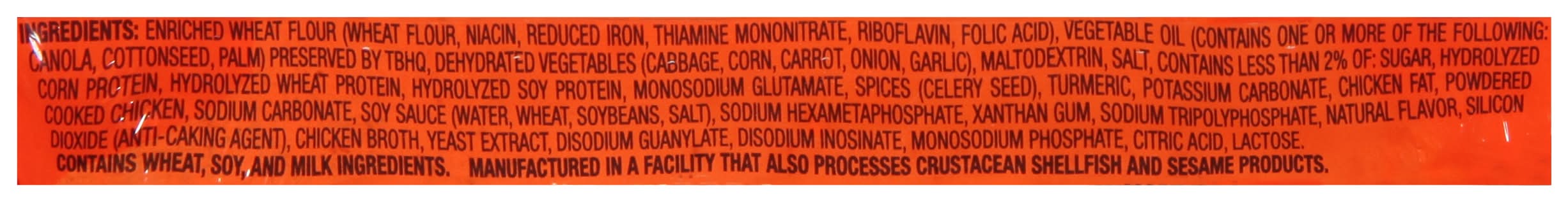 Ingredients: Enriched Wheat Flour (Wheat Flour, Niacin, Reduced Iron, Thiamine Mononitrate, Riboflavin, Folic Acid), Vegetable Oil (Contains One or More of the Following: Canola, Cottonseed, Palm) Preserved by TBHQ, Dehydrated Vegetables (Cabbage, Corn, Carrot, Onion, Garlic), Maltodextrin, Salt, Contains Less than 2% of: Sugar, Hydrolyzed Corn Protein, Hydrolyzed Wheat Protein, Hydrolyzed Soy Protein, Monosodium Glutamate, Spices (Celery Seed), Turmeric, Potassium Carbonate, Chicken Fat, Powdered Cooked Chicken, Sodium Carbonate, Soy Sauce (Water, Wheat, Soybeans, Salt), Sodium Hexametaphosphate, Xanthan Gum, Sodium Tripolyphosphate, Natural Flavor, Silicon Dioxide (Anti-Caking Agent), Chicken Broth, Yeast Extract, Disodium Guanylate, Disodium Inosinate, Monosodium Phosphate, Citric Acid, Lactose Contains: Wheat, Soybeans, Milk, Corn, Celery, Lactose, Crustacean Shellfish, Crab, Sesame